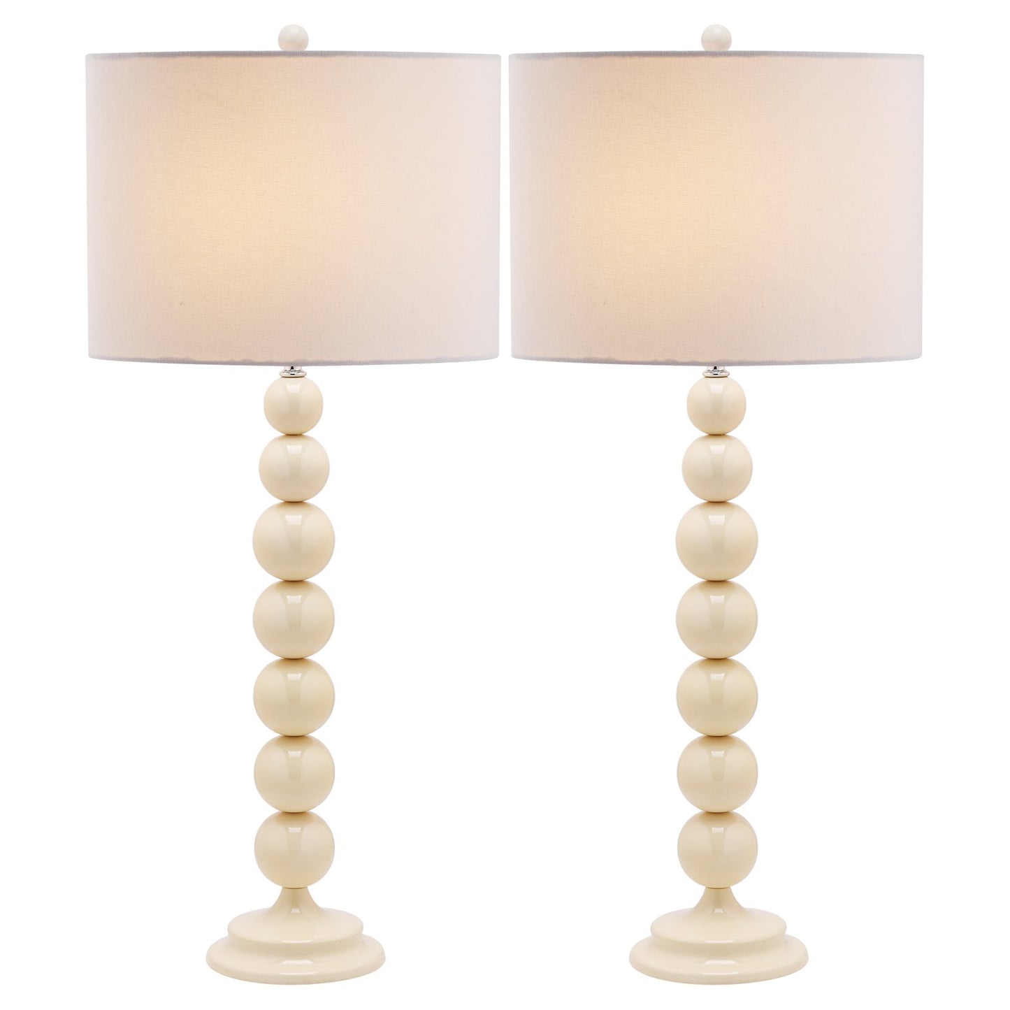 Light up your life with the perfect symmetry of this gleaming white stacked ball lamp. The tall, lean silhouette adds height on a console or hall table and the uniform color of base, neck and final are complemented by the white cotton drum shade.