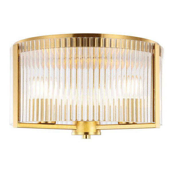 This Jetra Flush Mount is a must have for industrial chic or urban d̩cor. Jetra‰۪s brass metal frame and clear glass shade highlight the decoratively exposed bulbs and hardware, shining boldly in any room.