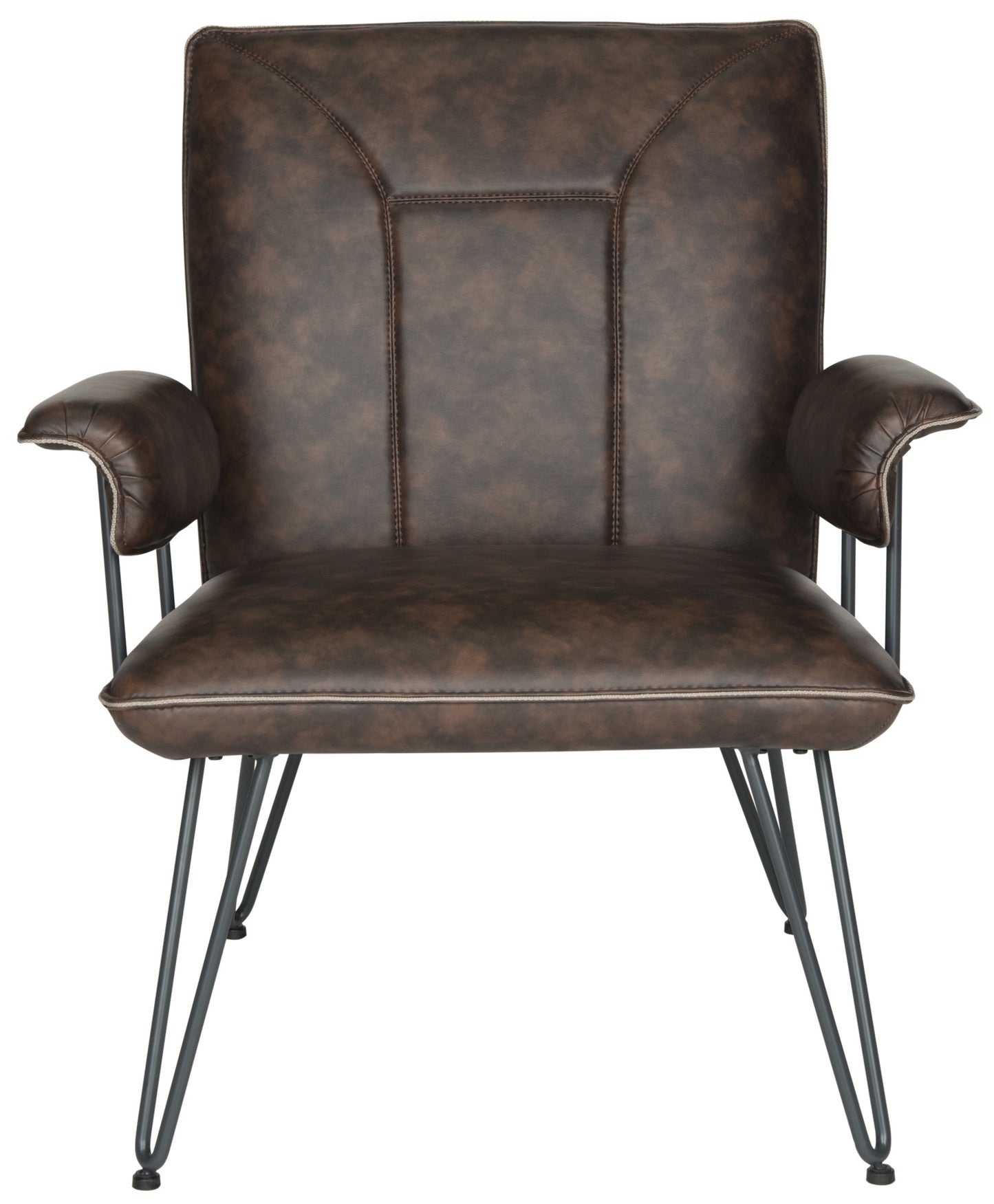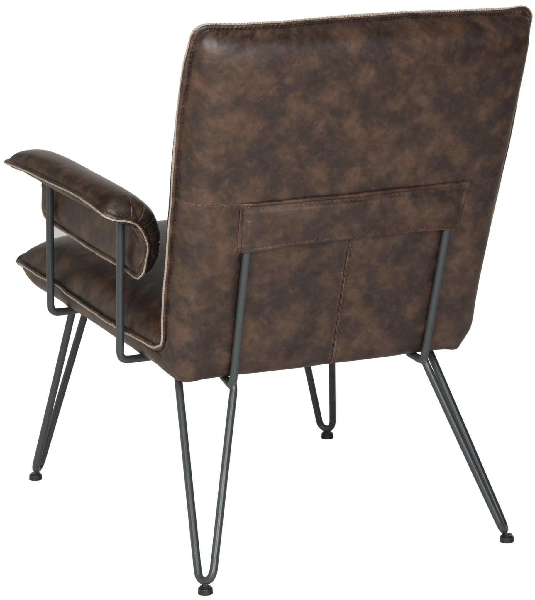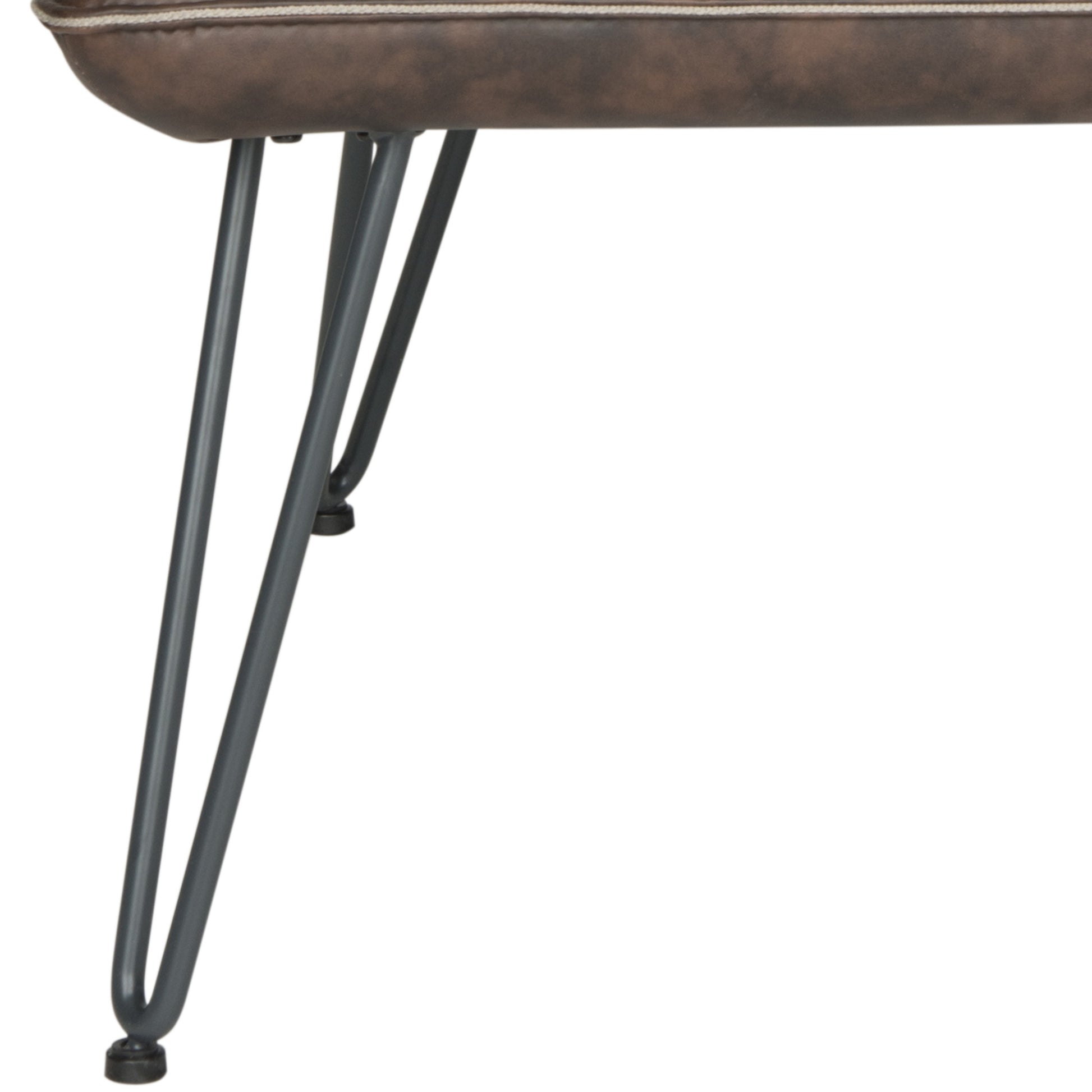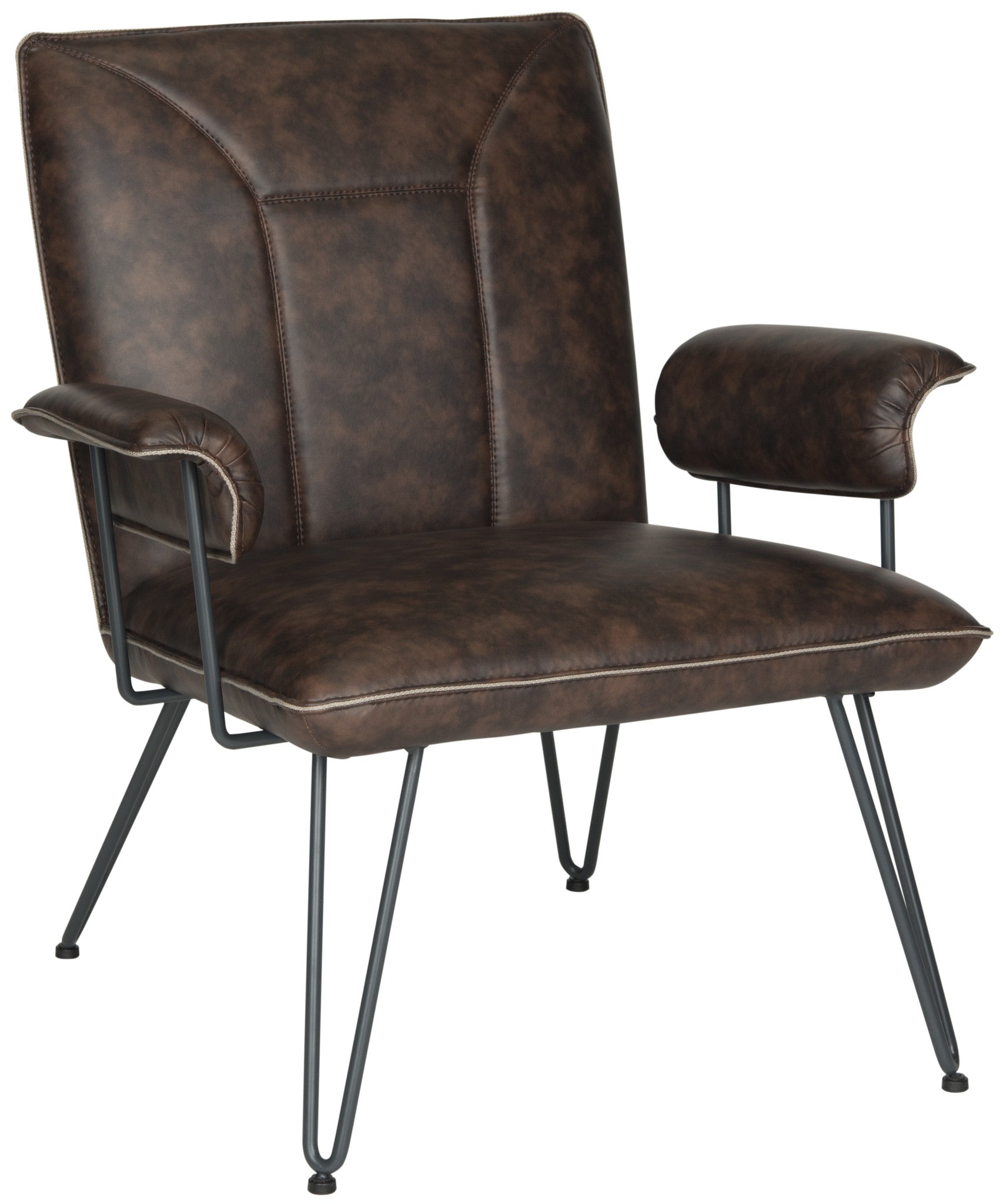 Retro Modern design is celebrated in this streamlined arm chair softened with antique brown PU leather upholstery for a vintage look. Blue-grey power-coated steel gives the hairpin legs a fashion edge for mid-century or contemporary interior settings.