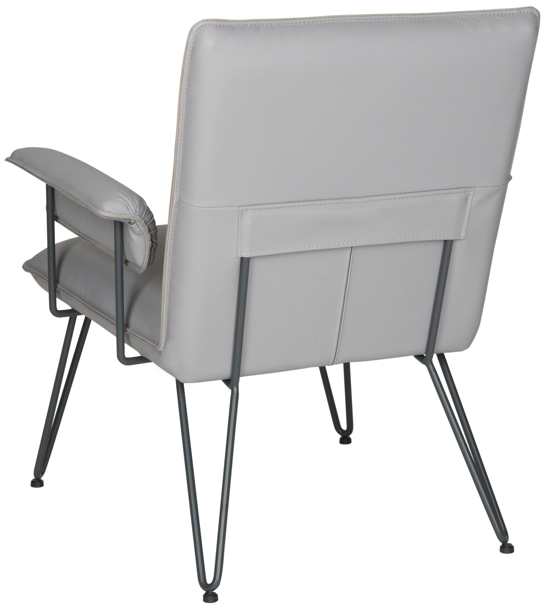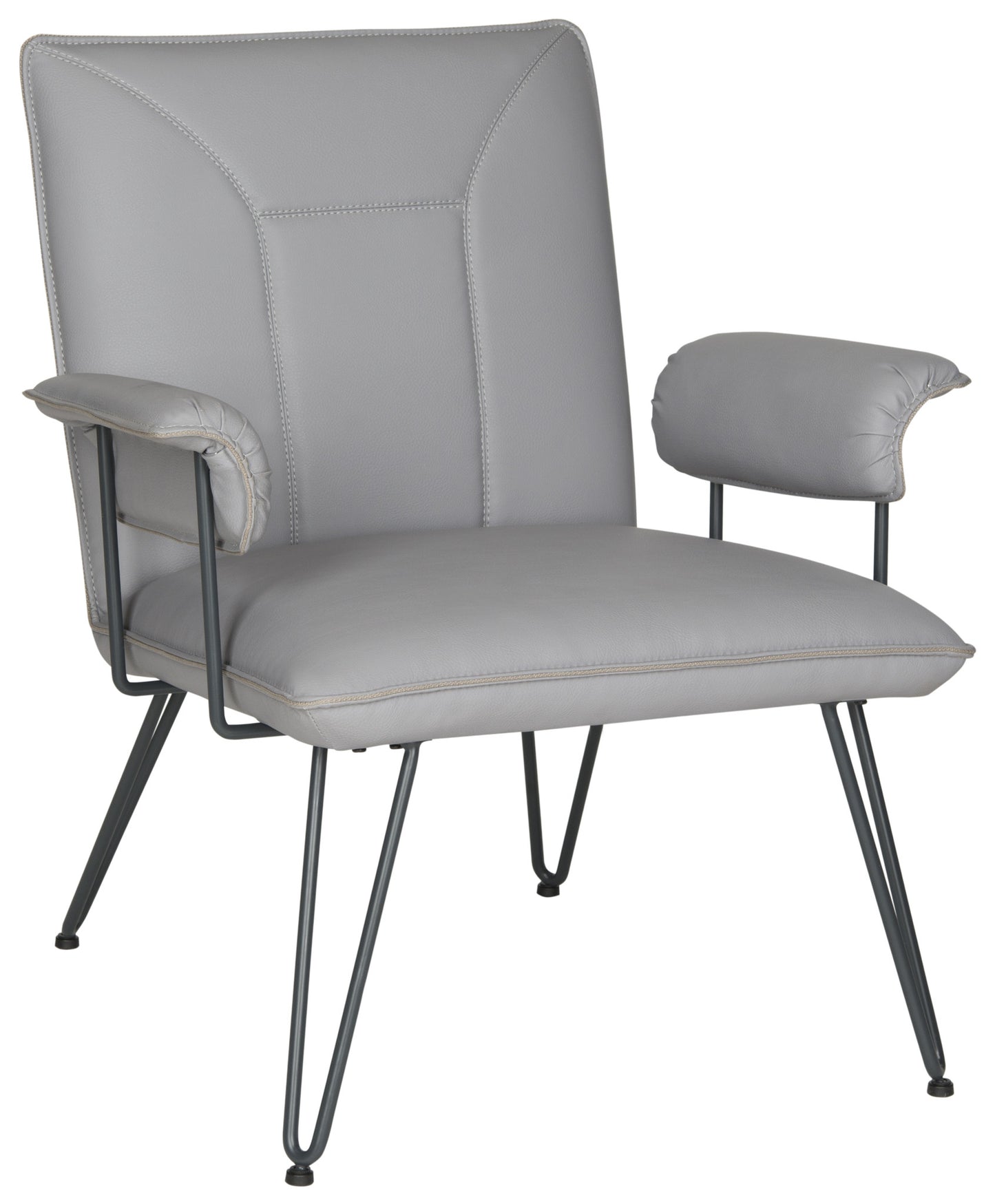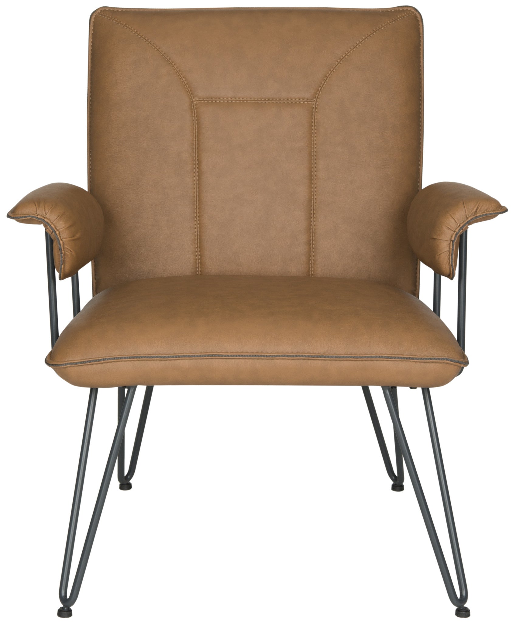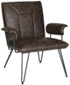 Retro Modern design is celebrated in this streamlined arm chair softened with antique brown PU leather upholstery for a vintage look. Blue-grey power-coated steel gives the hairpin legs a fashion edge for mid-century or contemporary interior settings.