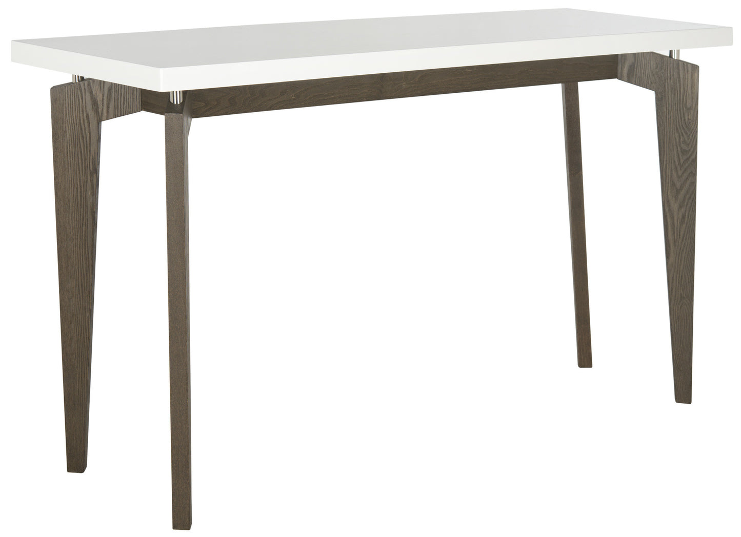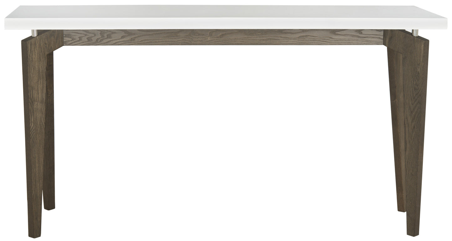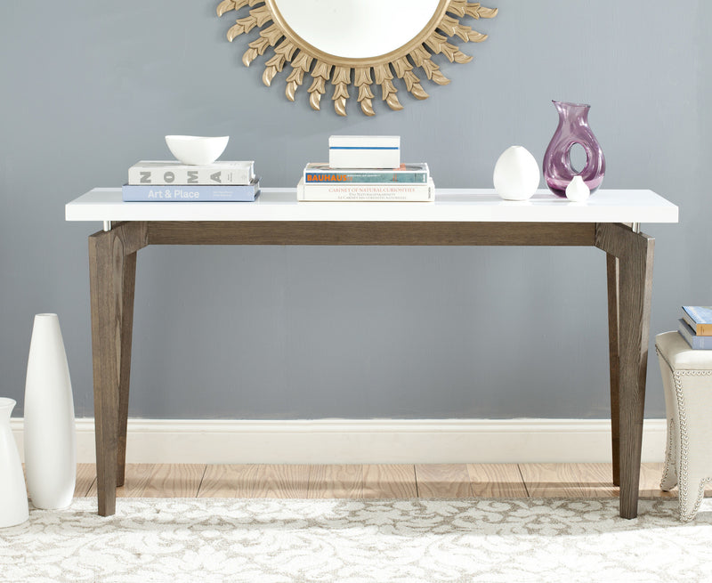 Urban yet refined, the Joseph console floats a shiny white lacquer top resting on thick metal posts to a base with dark brown wood grained legs. Graphic and sleek, this console table is a canvas for interesting displays of collectibles, books and more.