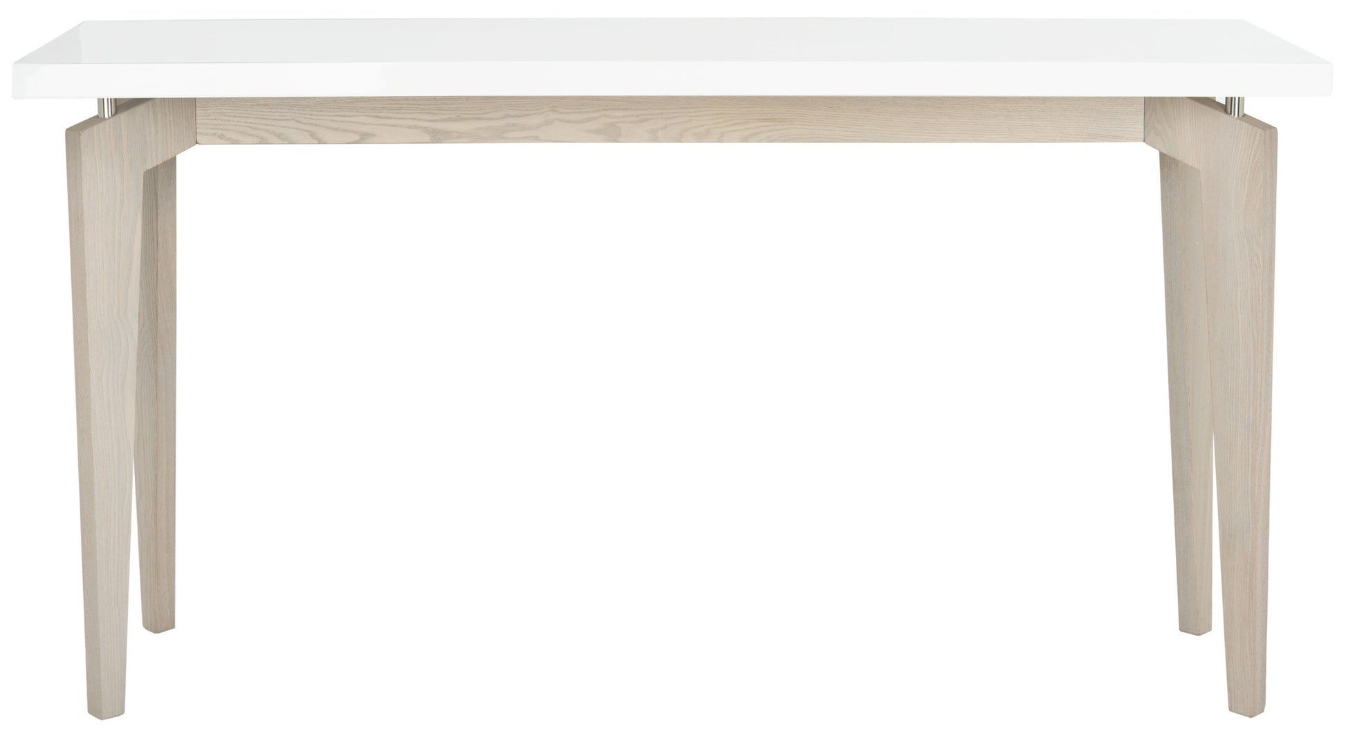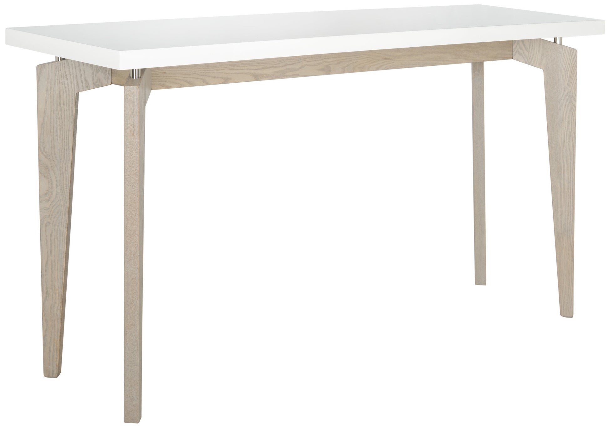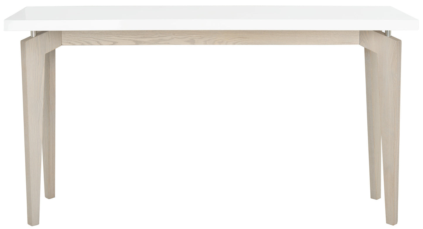 Urban yet refined, the Joseph console floats a shiny white lacquer top resting on thick metal posts to a base with dark brown wood grained legs. Graphic and sleek, this console table is a canvas for interesting displays of collectibles, books and more.