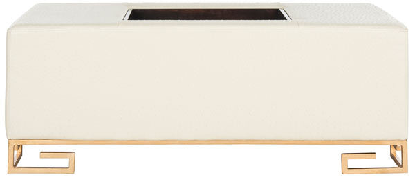 An exquisite pairing of form and function, this contemporary tray ottoman was inspired by the inimitable glamour and optimism of Old Hollywood. Ideal for entertaining, its decadent gold metal finish and crå¬me upholstery frame its removable tray.
