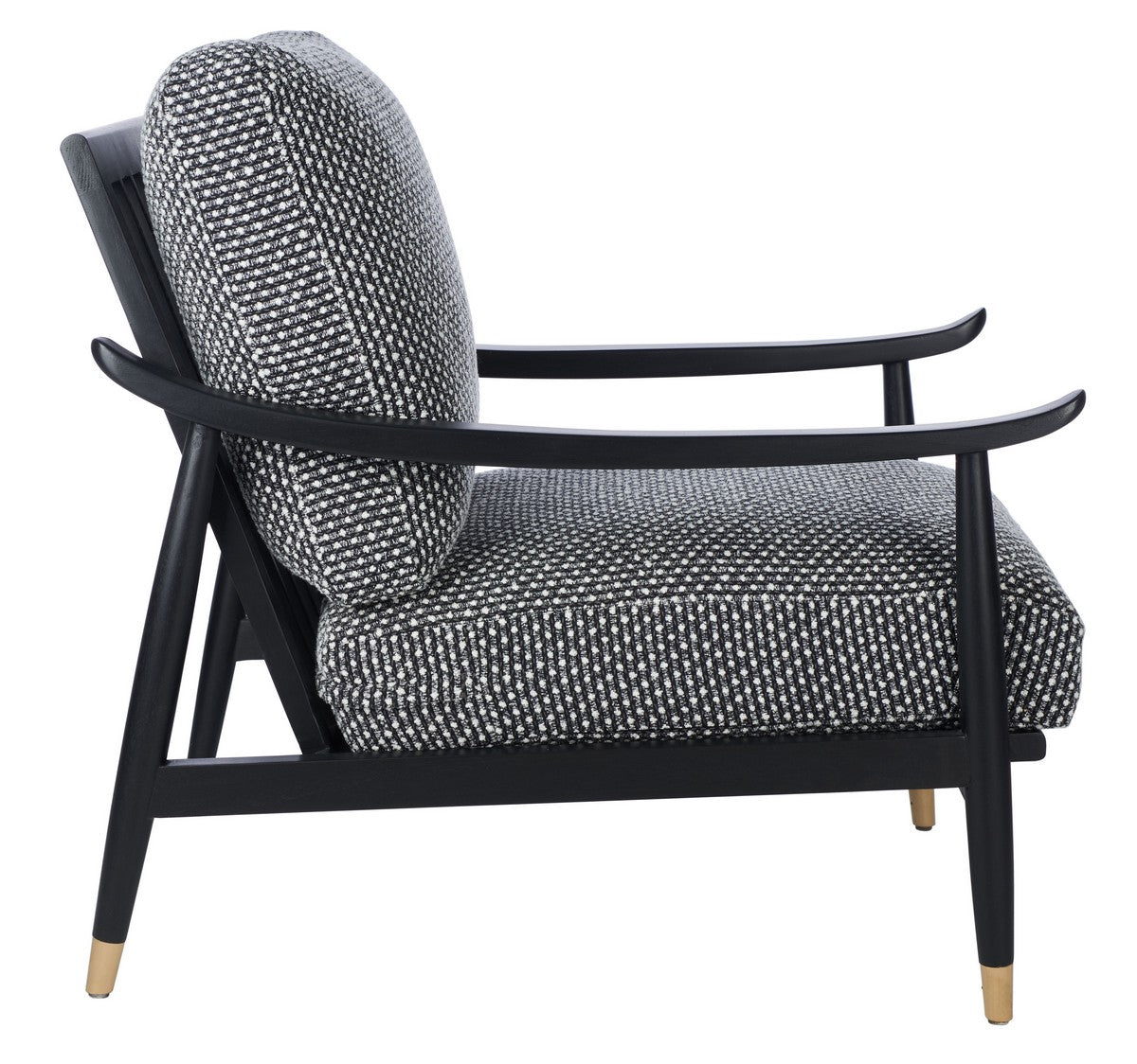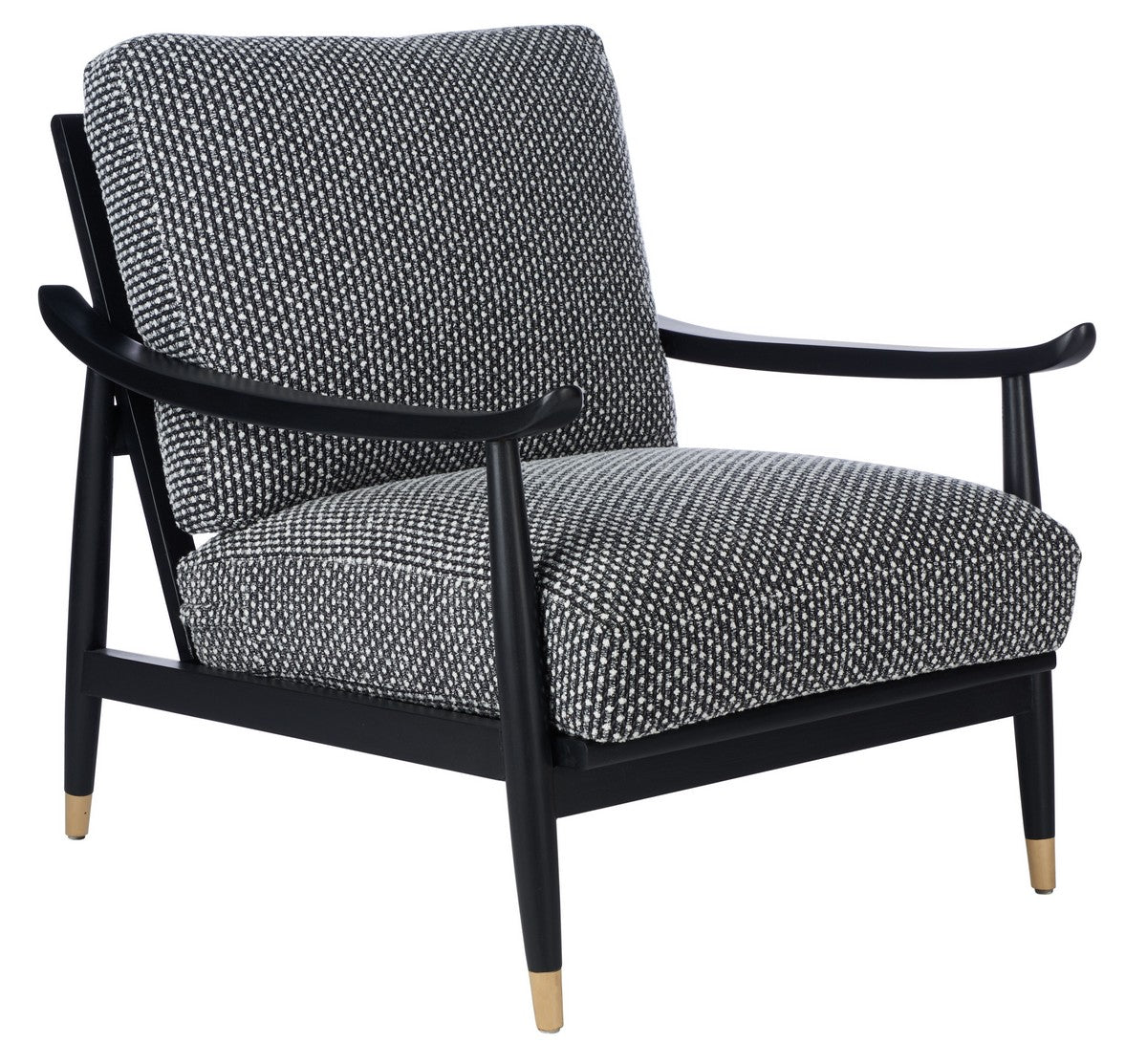 A Mid-Century icon is revitalized for modern interiors in this Kiara Accent Chair. A sculpted black mahogany frame beautifully supports Kiara‰۪s black and white checked linen cushions, enriching any d̩cor with plush comfort and unmatched style. Kiara‰۪s brass cap accents add a touch of glamour.