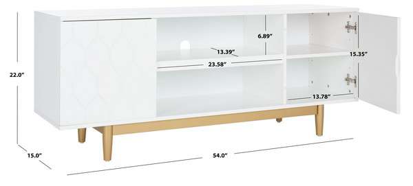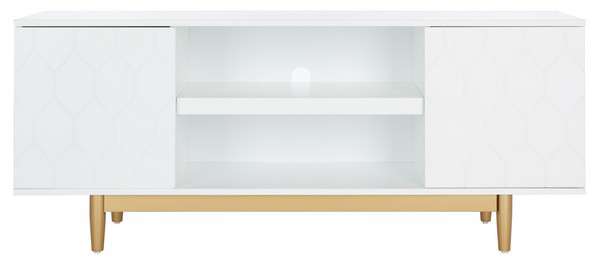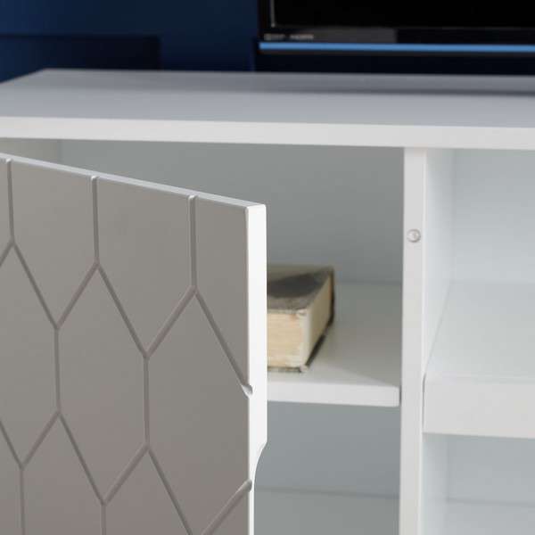 An absolute showstopper in any entertainment space, this Kit Media Stand is a sophisticated standout. The etched hexagon honeycomb pattern on Kit‰۪s two doors beautifully enlivens its clean white frame, while Mid-Century inspired legs make Kit a glamorous style icon. Two open shelves provide perfect storage for consoles or devices.