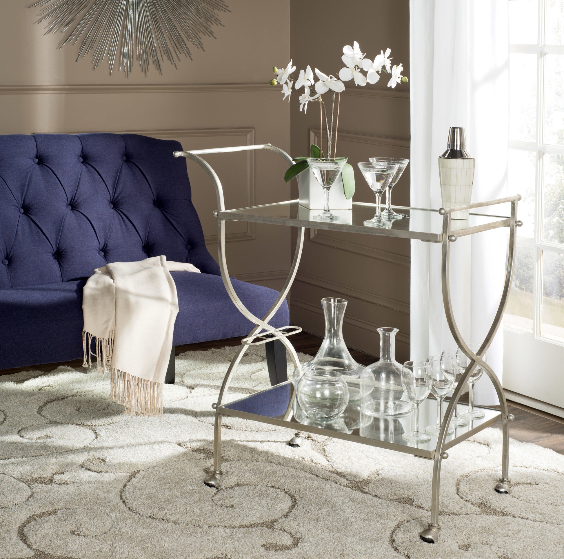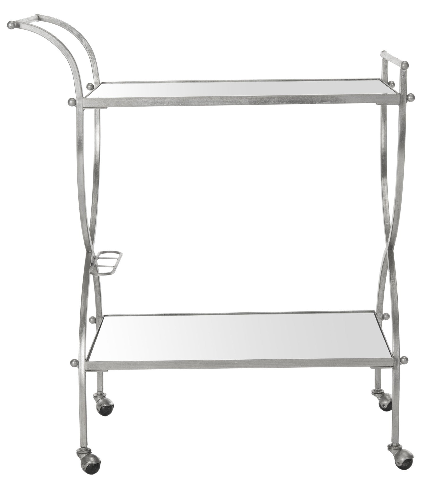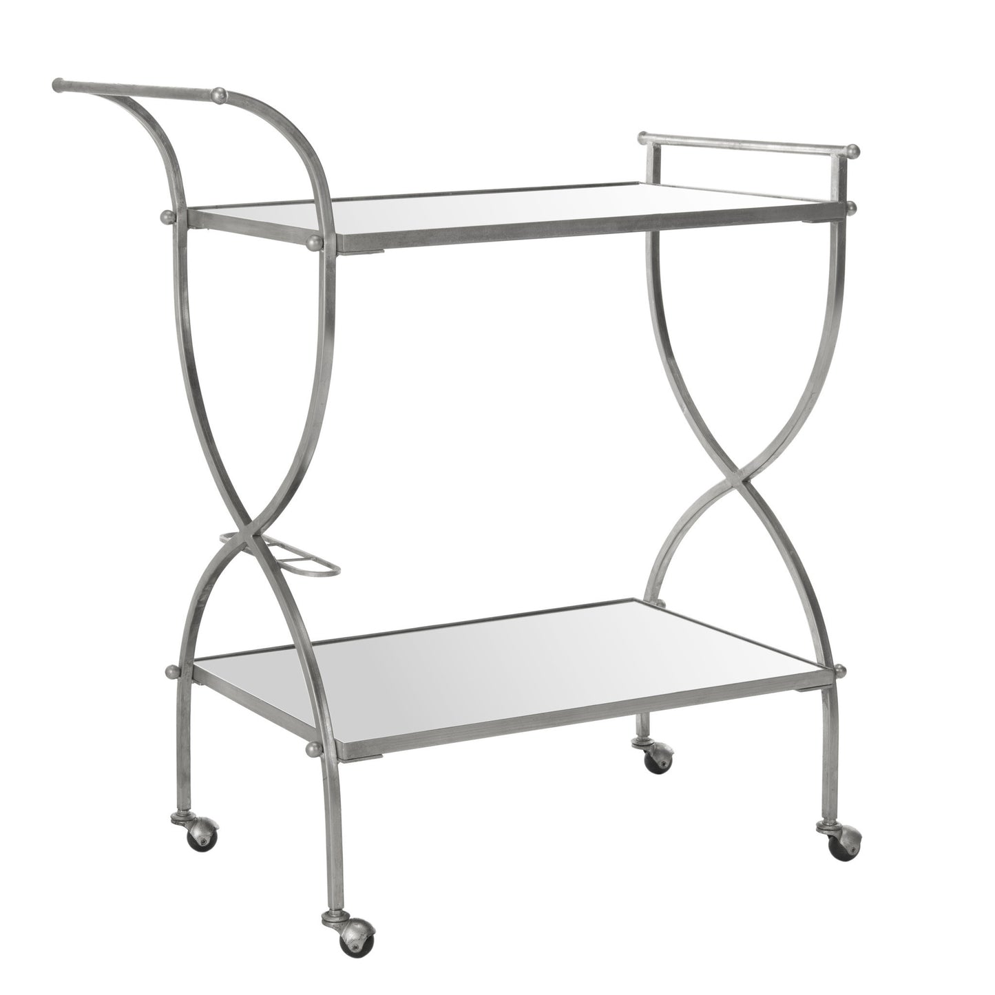 Restaurant-chic service can be yours at home with the portable Lucretius bar cart. Its graceful handles and elegant frame of beautifully forged iron in a lustrous silver finish are contrasted with mirrored glass shelves for barware, bottles and more.