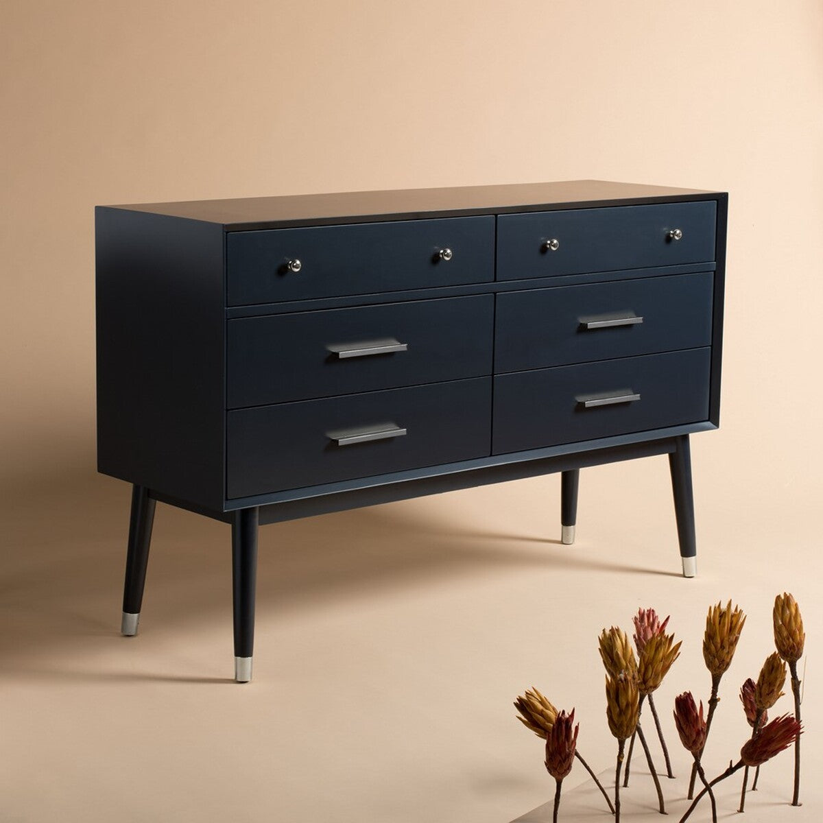 The mod style and character of this retro dresser updates any bedroom. Crafted with a navy wood veneer, its contemporary, sleek surface highlights the charming vintage style silver hardware on its six drawers and chic capped legs.