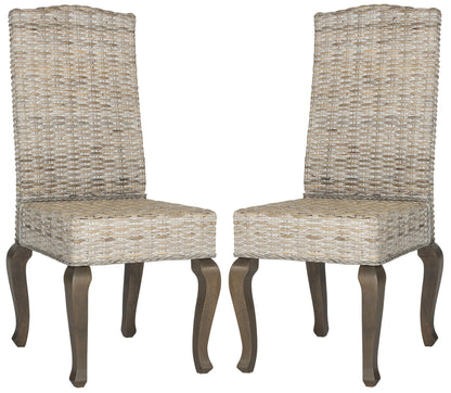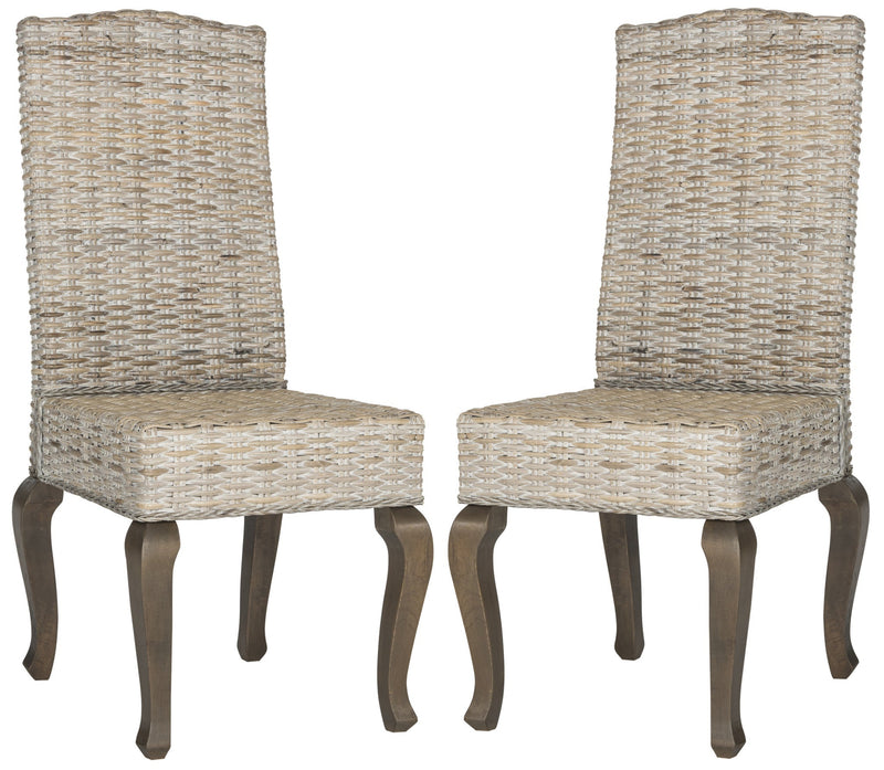 Classically French in silhouette, but with new tropical island flair, this set of two Kubu rattan dining chairs will adapt to casual urban and coastal interiors. Finished in grey, the natural shading of woven rattan imbues each chair with unique charm.