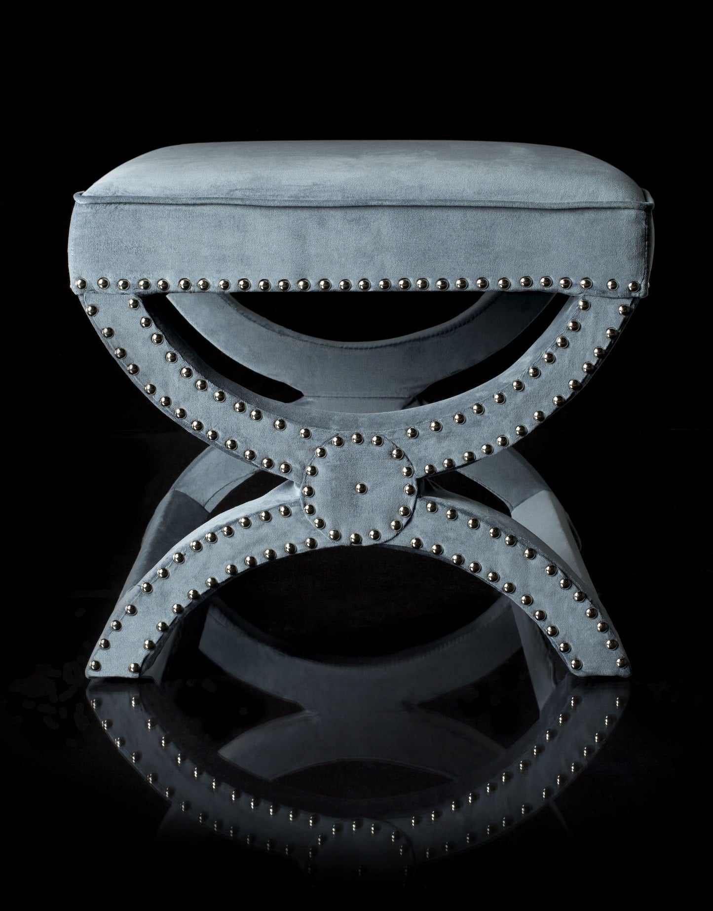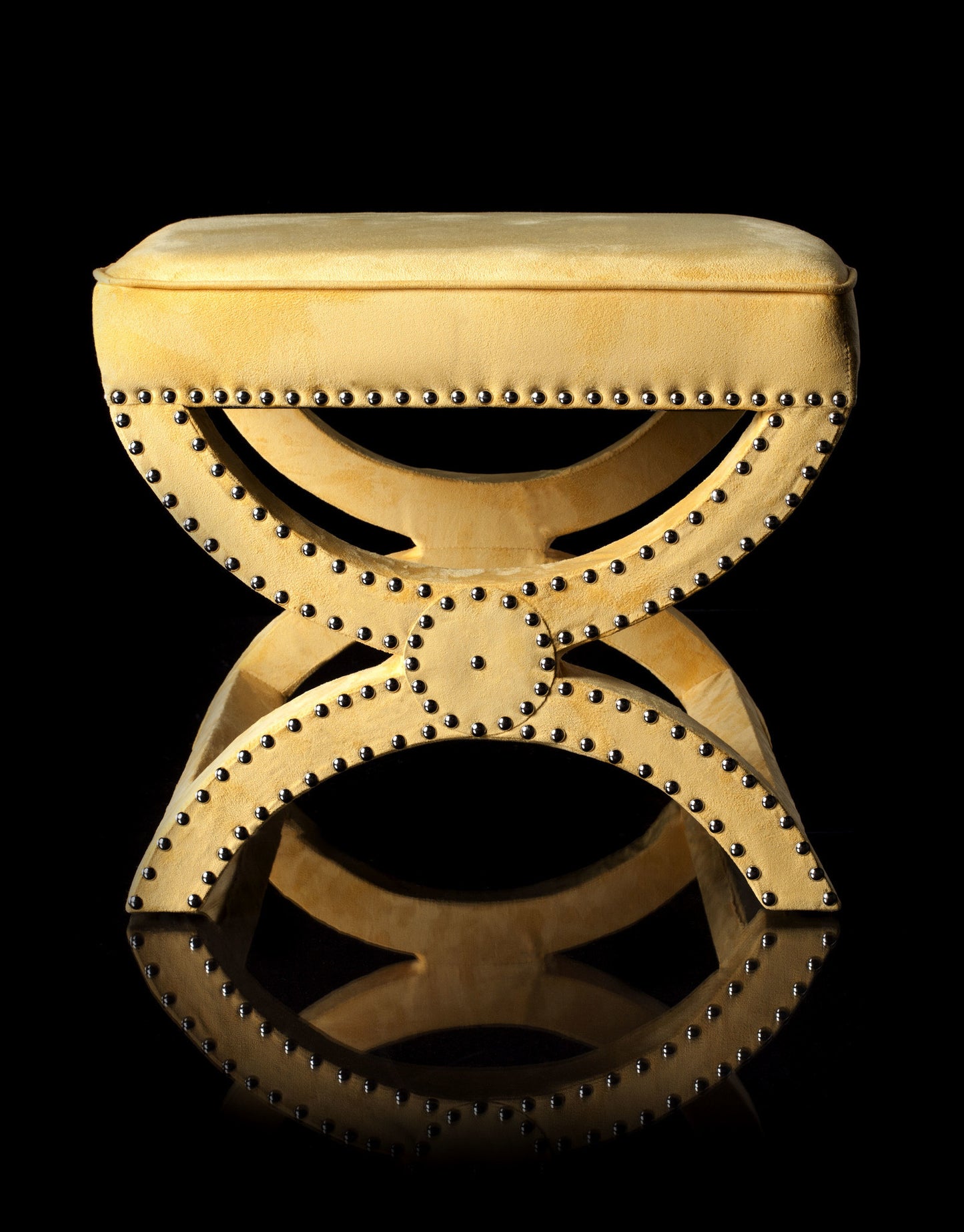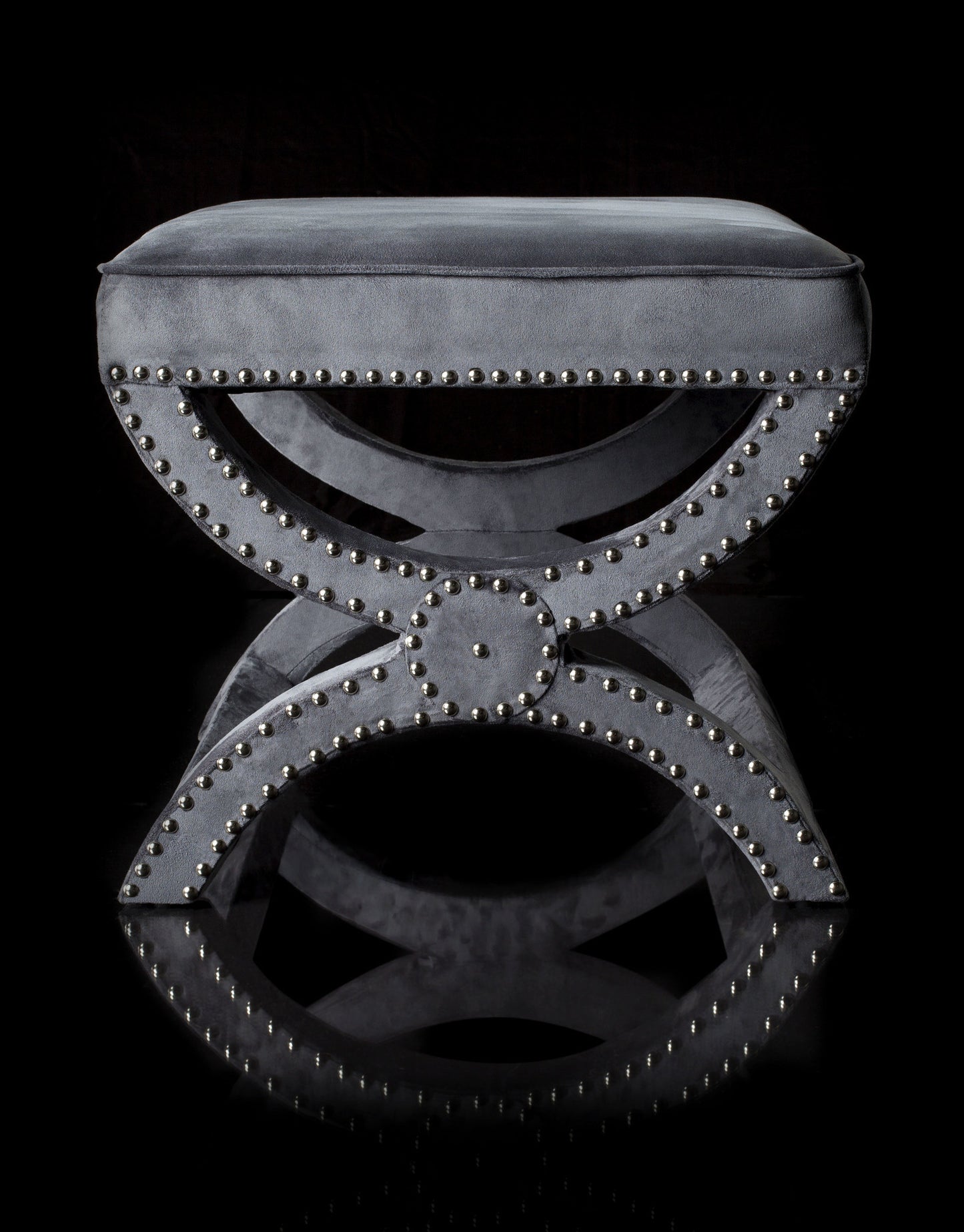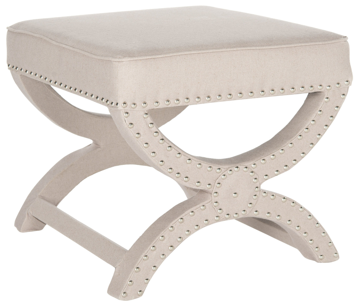 A contemporary descendant of the Savonarola chair originally named for a 15th-century Dominican cleric, our Mystic bench bears the distinctive curved X that forms its graceful legs. Upholstered in taupe linen with self-welting nickel nail head detailing, use Mystic in pairs under a console, in front of the bed or for extra seating anywhere you want a touch of glamour.