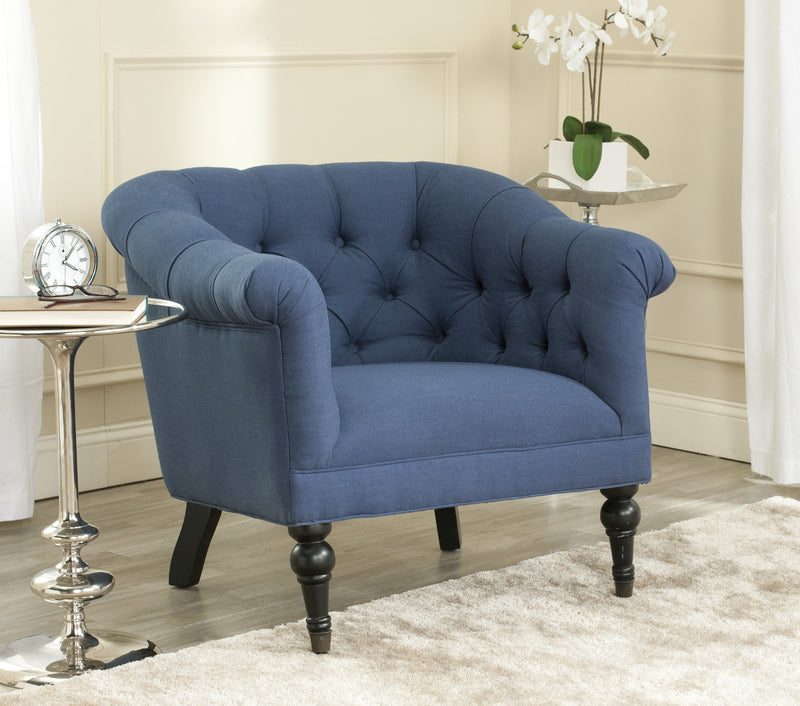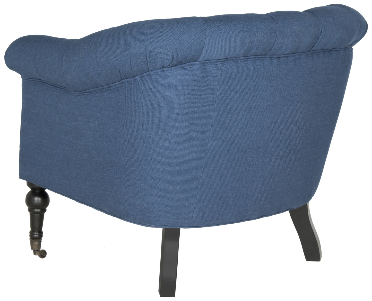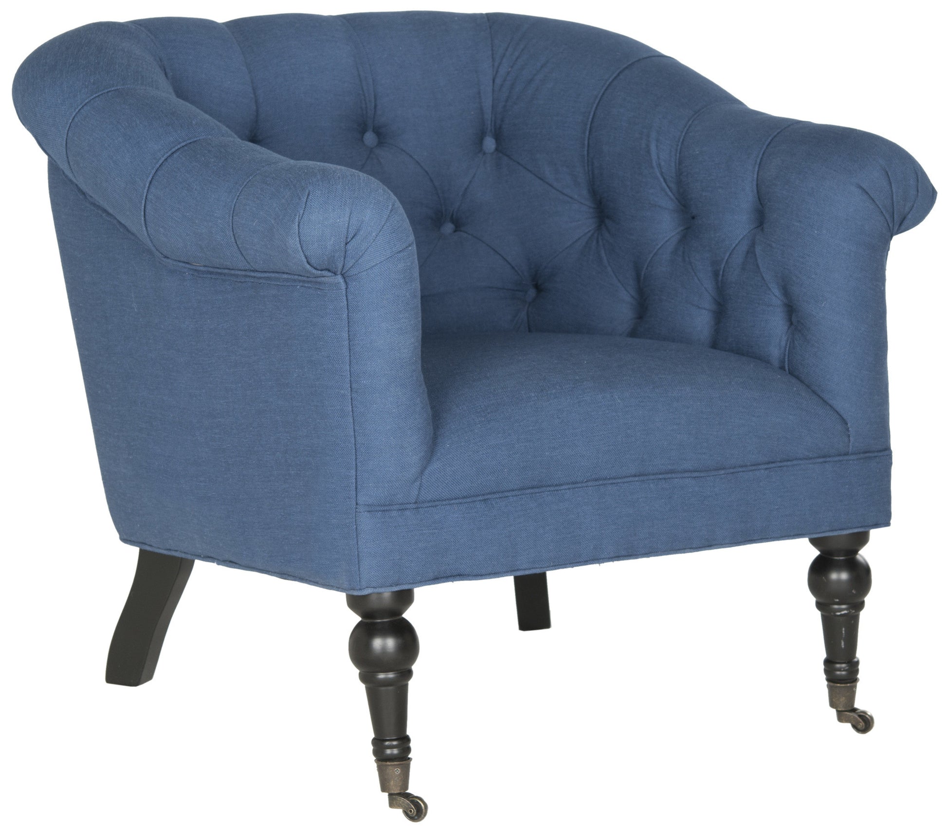 Gracious and inviting, the traditionally-styled Nicolas club chair is equally good-looking in transitional rooms. The texture of linen in pretty steel blue is accented with beautifully draped rolled arms, button tufting and turned birch legs on casters.