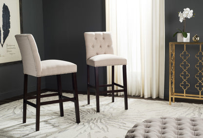 Elevate the taste level in any room with these posh modern barstools (set of 2). Their plush, tufted beige upholstery and sturdy espresso legs make them ideal for savoring petit dejeuner in the morning or a glass of wine after the sun goes down.