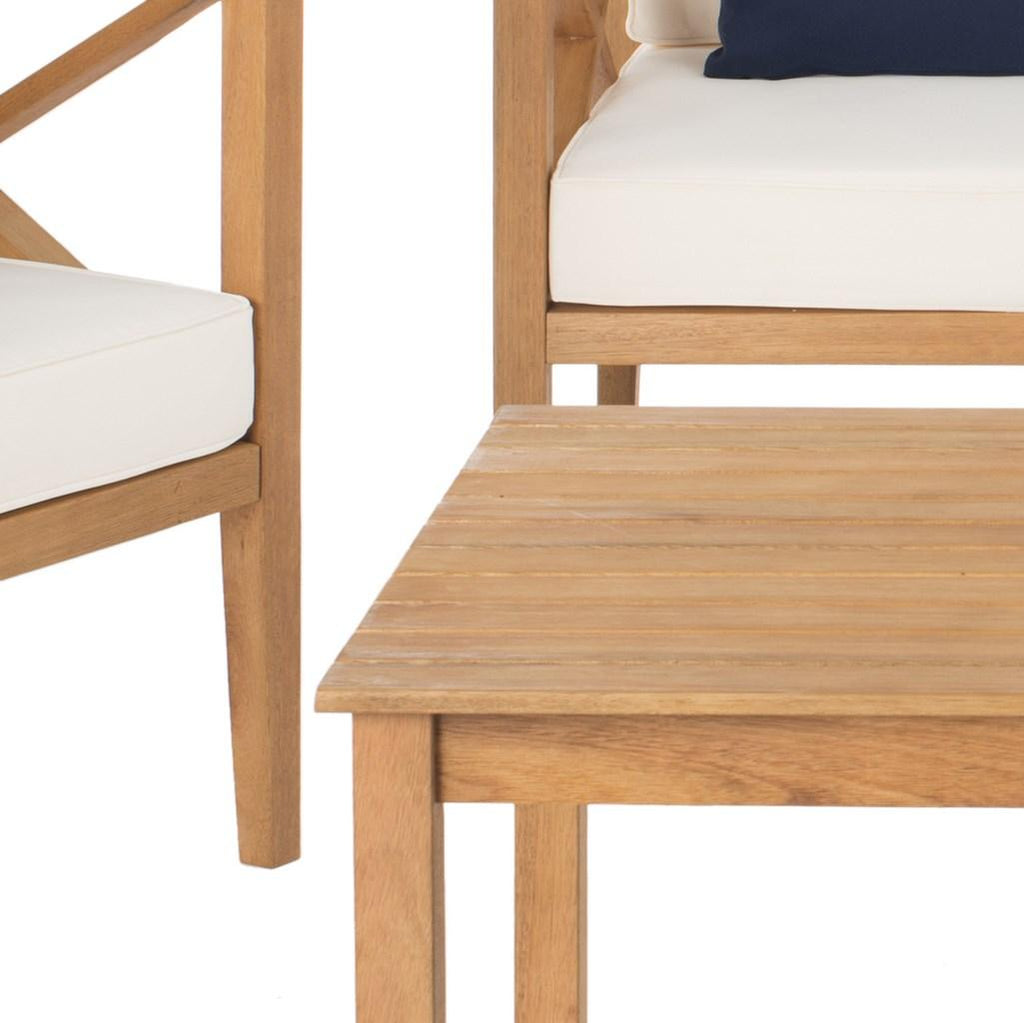 Update any outdoor living space with this contemporary 4-piece outdoor set. Crafted in a natural hue, designers love its modern cross-back style. Ideal for all outdoor entertaining, its plush beige upholstery with navy accent pillows makes it a great investment.