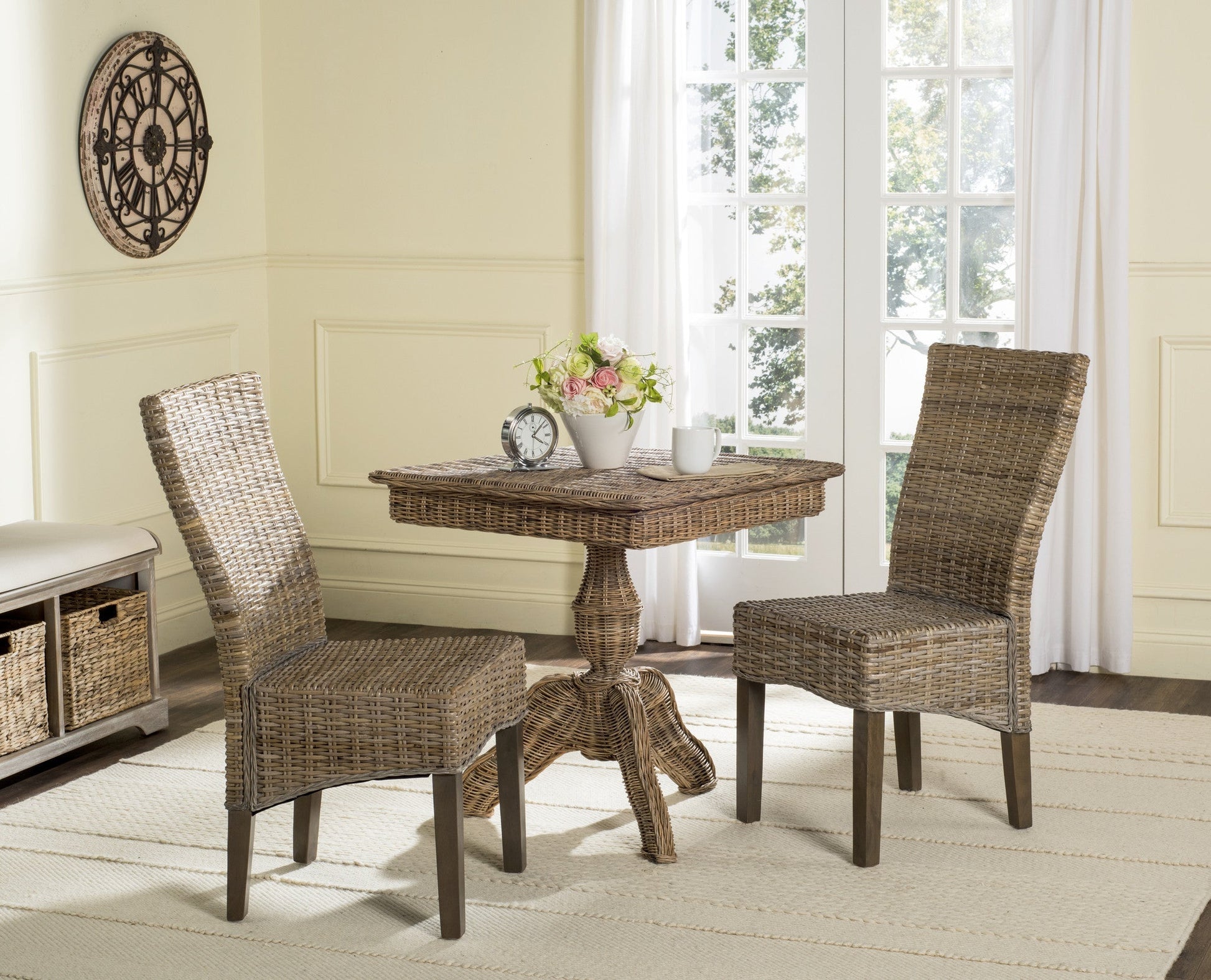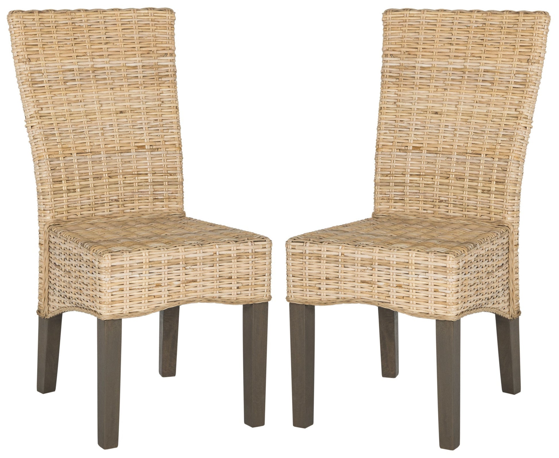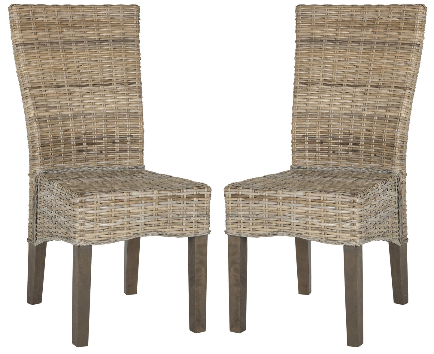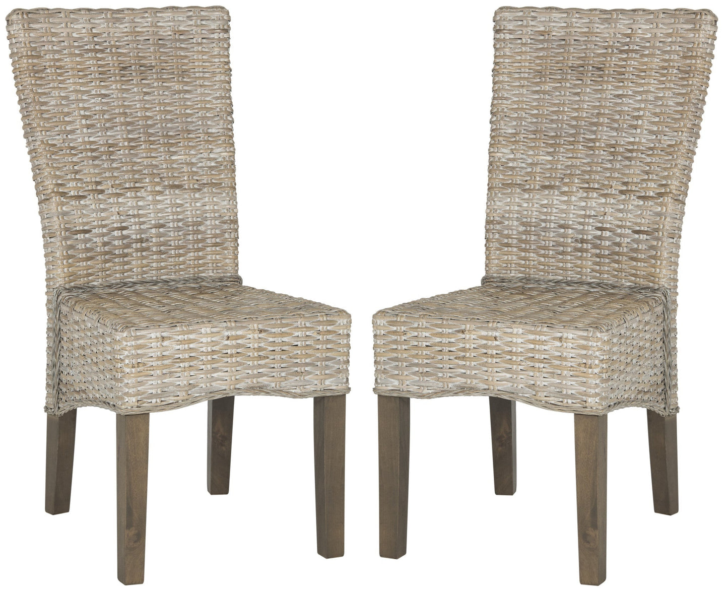 Artfully crafted of Kubu rattan in a chic grey finish, this set of two transitional dining chairs brings fashion flair to the table with soft-scalloped apron and slightly flared back. Adding to the artisan look, each chair is unique in shading and color.