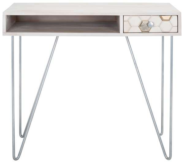 Make a bold style statement with this stunning Raveena Desk. Raveena's whitewash finish and asymmetric top is given a glamorous touch with a captivating, carved honeycomb pattern, glamorously highlighted with silver details that beautifully pair with matching hairpin legs.