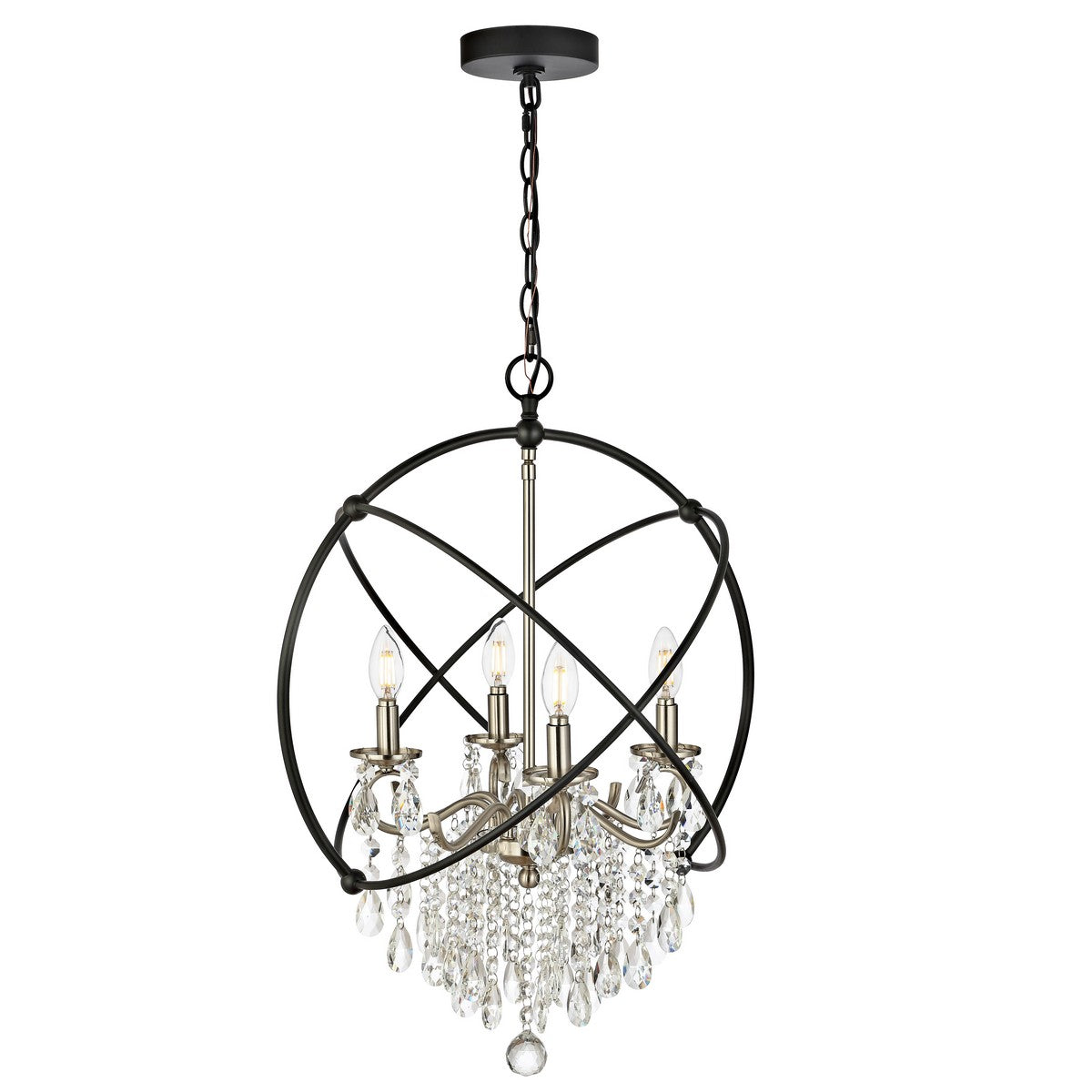 A powerful, stunning focal point any living room or dining room, this extraordinary pendant glows with the sparkle of brilliant crystals. Its light bronze and black finish adorns the modern geometric sphere that frames its luxurious interior candelabra.
