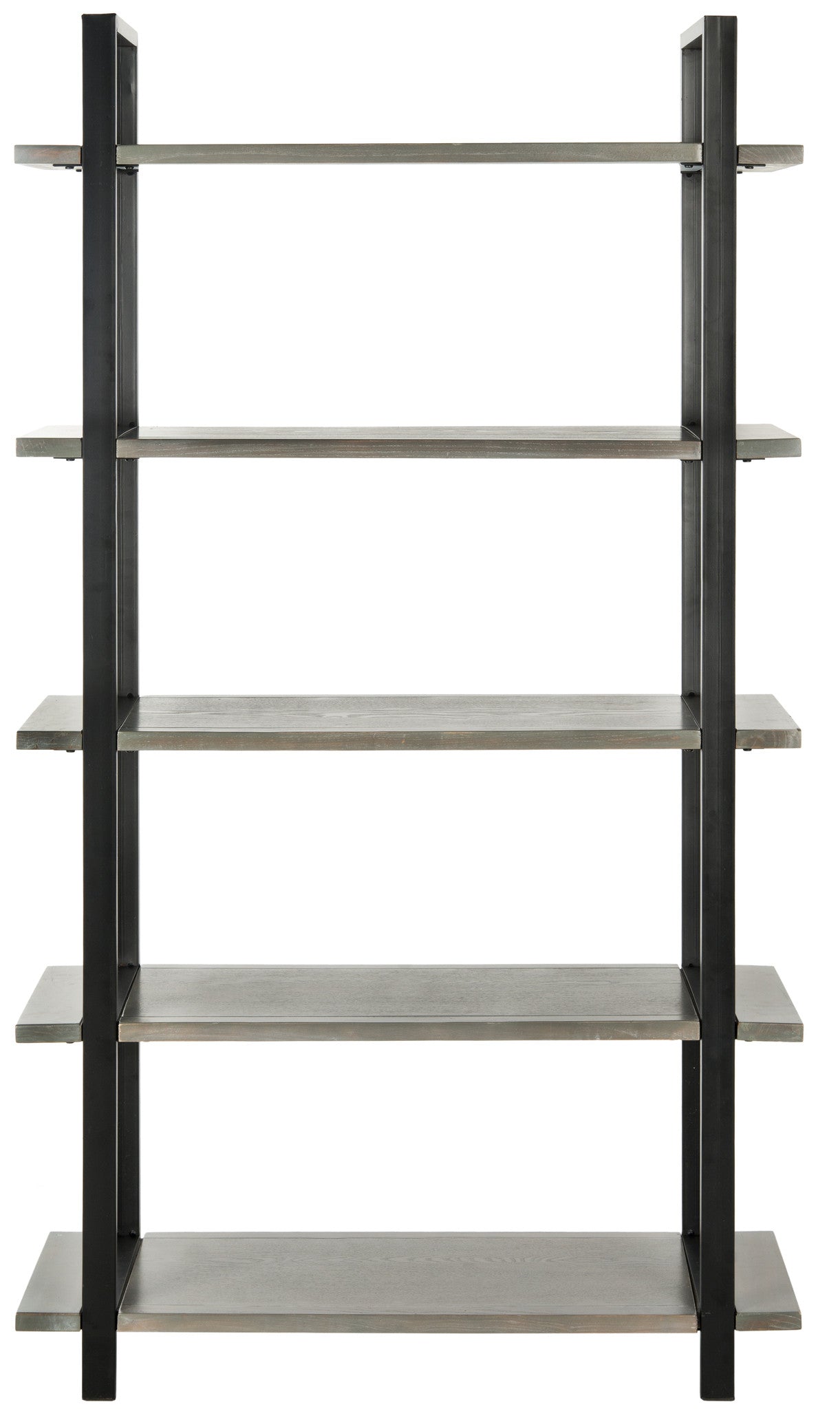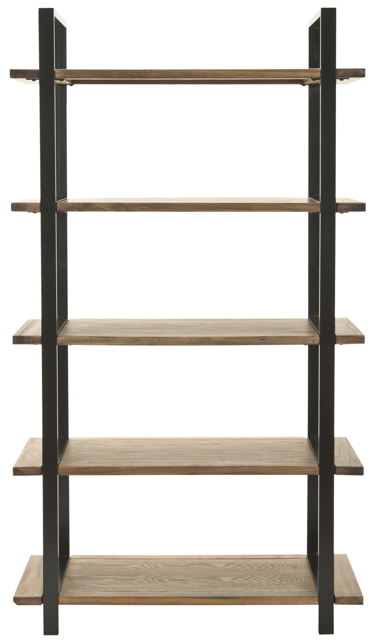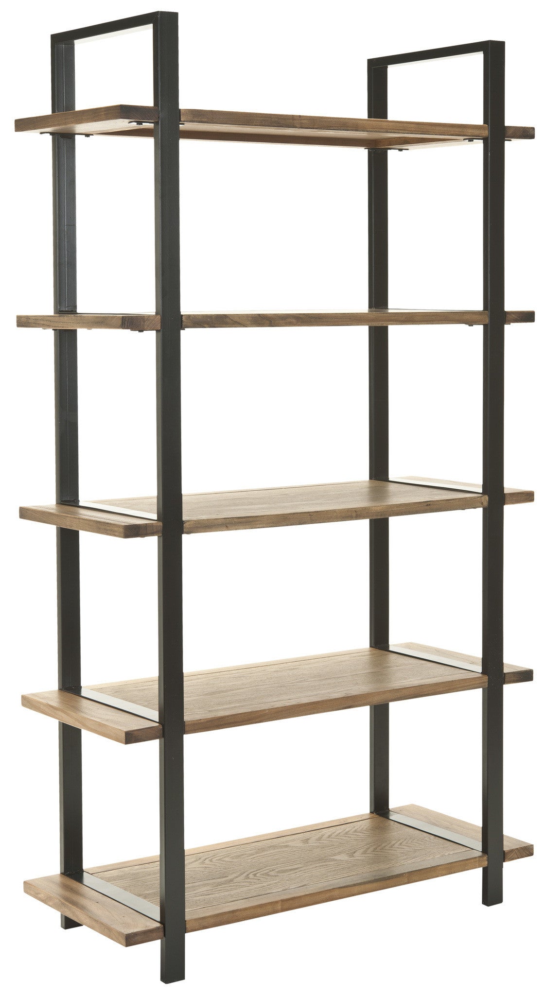 Industrial and contemporary, the Scott etagere boasts brown-toned elm shelves that seem to float on wrap-around frames of dark metal. Ideal for any room in the home and perfect for the office, this sophisticated piece makes a statement on its own and a dramatic architectural look in pairs. Use the Scott etagere to store favorite books and curios in style.