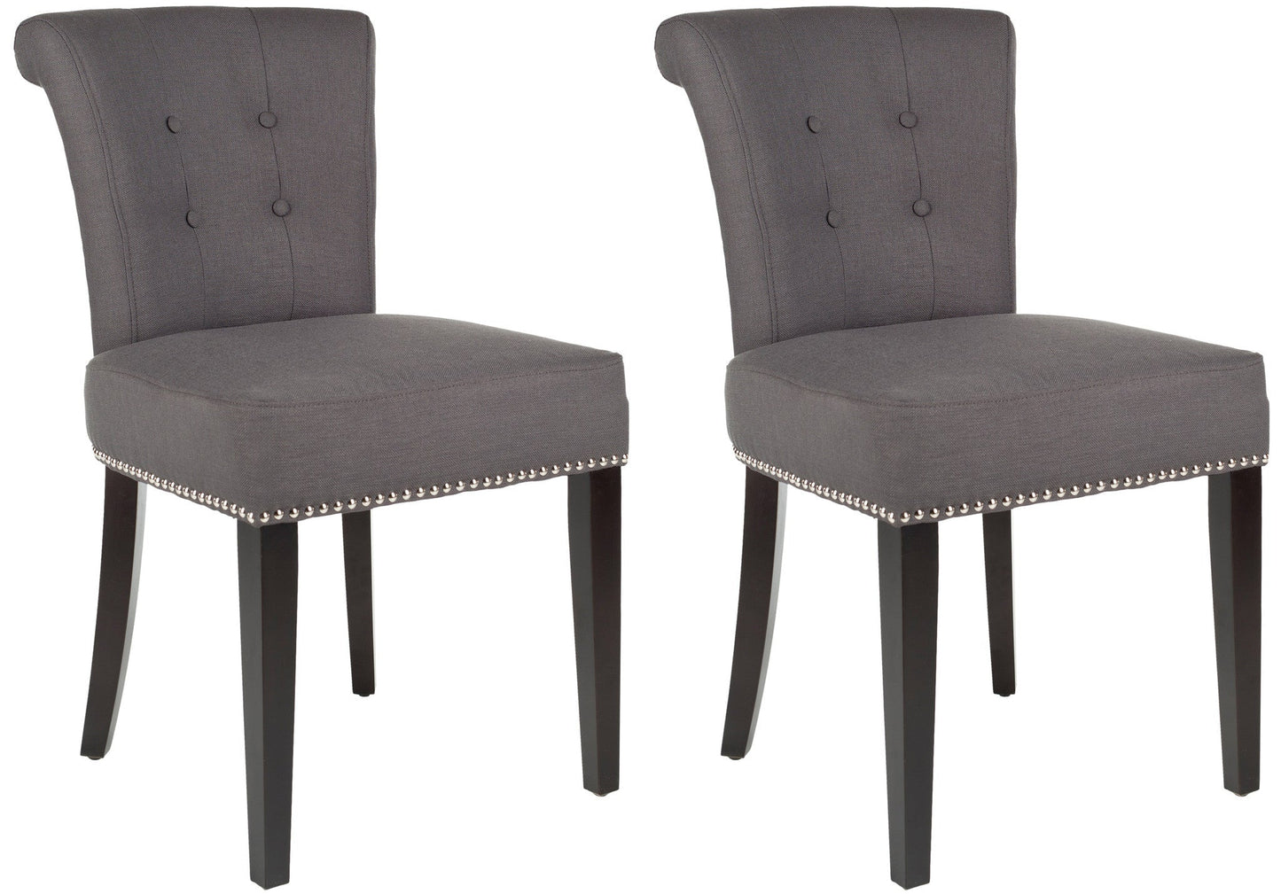 The bent back of the Sinclaire dining chair, in charcoal fabric with espresso finish on the legs, gets a classic dressed-up punch thanks to exposed nail heads and cleaver metal ring on its back. Button tufts on the front of the tapered backrest and generous cushions make it a handsome seat.