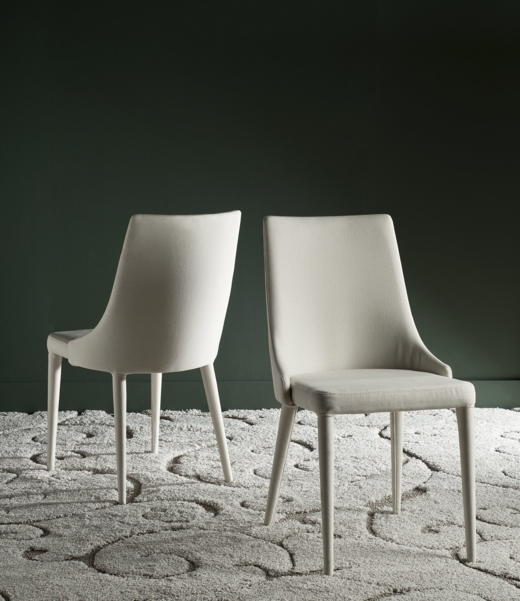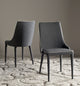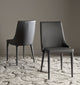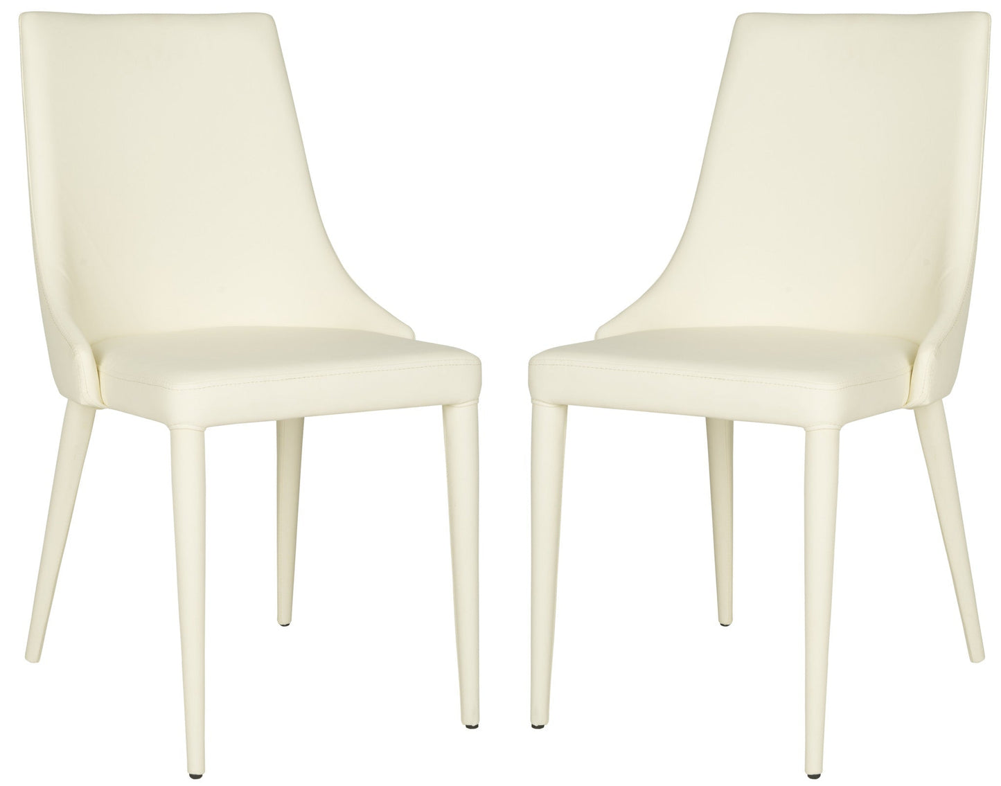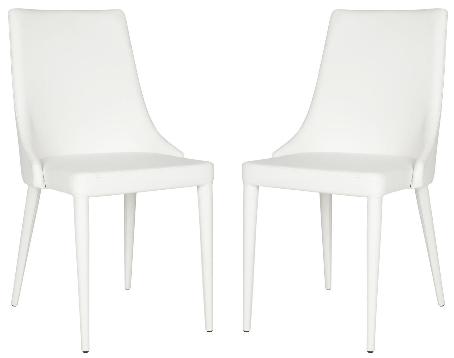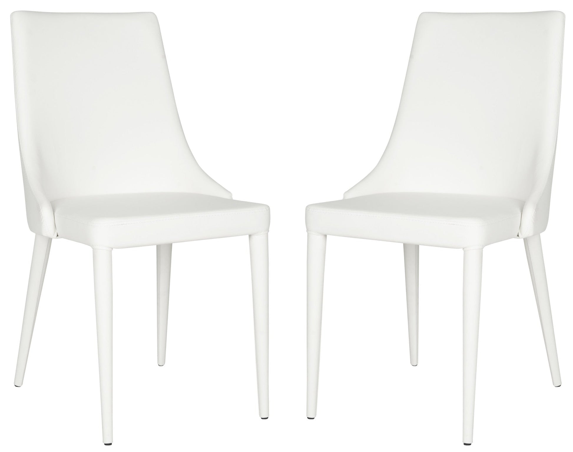 The white chair becomes an ideal dining companion when it's crafted of easy-care PU leather and a sturdy iron frame. This smart set of two side chairs combines the sleek style of the deco barrel chair with contemporary lines inspired by London's skyline.