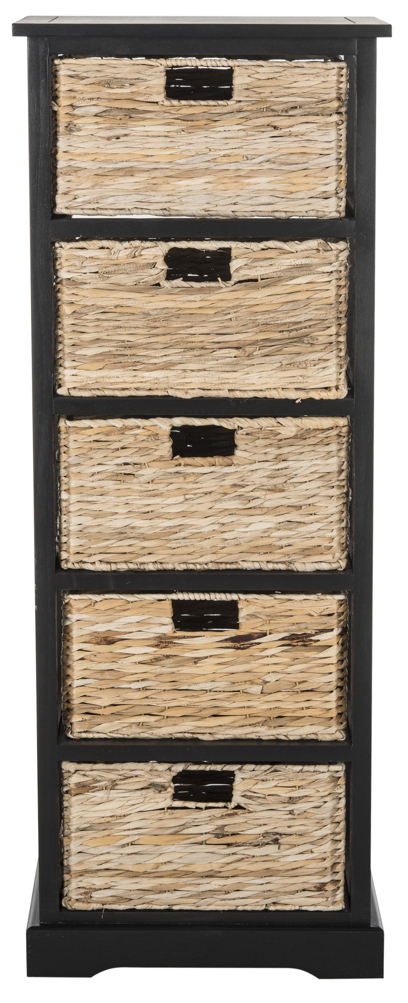 Fresh as a coastal breeze, this pretty and practical five-basket storage chest works equally well in a bathroom or bedroom. Crafted of pine with a distressed black painted finish, the simple frame has rattan weave pull out drawers for easy organizing.