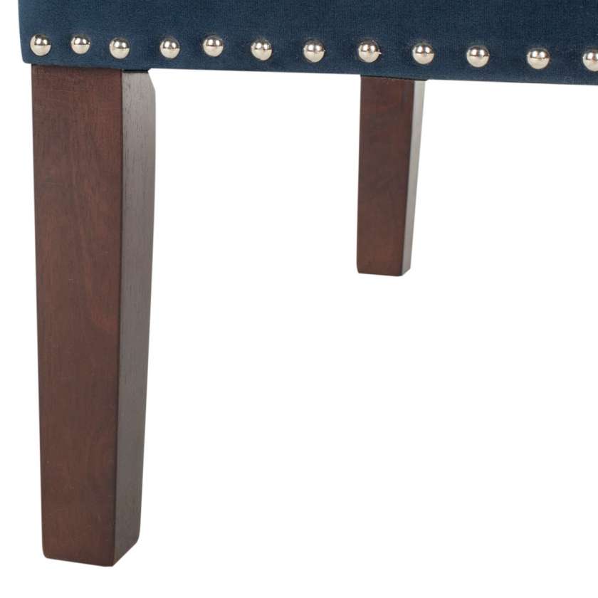 This modern love bench was inspired by the contemporary renovation of a Victorian bed and breakfast tucked into the hills of San Francisco. Ideal for any room, its navy upholstery features luxurious nailhead trim and tufted button detail.