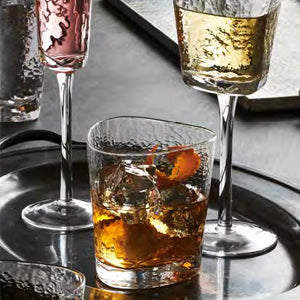 The soft ameboid shape and the gently hammered texture of the glass seem worthy for a party of angels so we named it Serapha™. The generous curve of this roughly triangular-shaped glass makes for easy drinking and impressed guests.