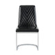 Perfect for your kitchen or breakfast nook, this chic dining chair will transform your room and add comfort and a touch of elegance. This chair is upholstered in tones of deep black faux leather (PU) with chevron embedded back design, providing an eye-catching and contemporary twist to traditional kitchen seating. Decorating possibilities are endless with the attractive tones of this chair. Additional It include horseshoe style chrome toned rounded metal base and ample padding, continuing the delightful look and comfy feel of this seating. Quality craftsmanship in every facet of production ensures durability and long-lasting wear. For an attractive, modern take on kitchen or dining room furnishings, this chair is a can’t miss choice in comfortable seating.
