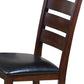 | Solid wood dining chairs in a transitional style with a black faux leather cushiony upholstered seat and slat back. |