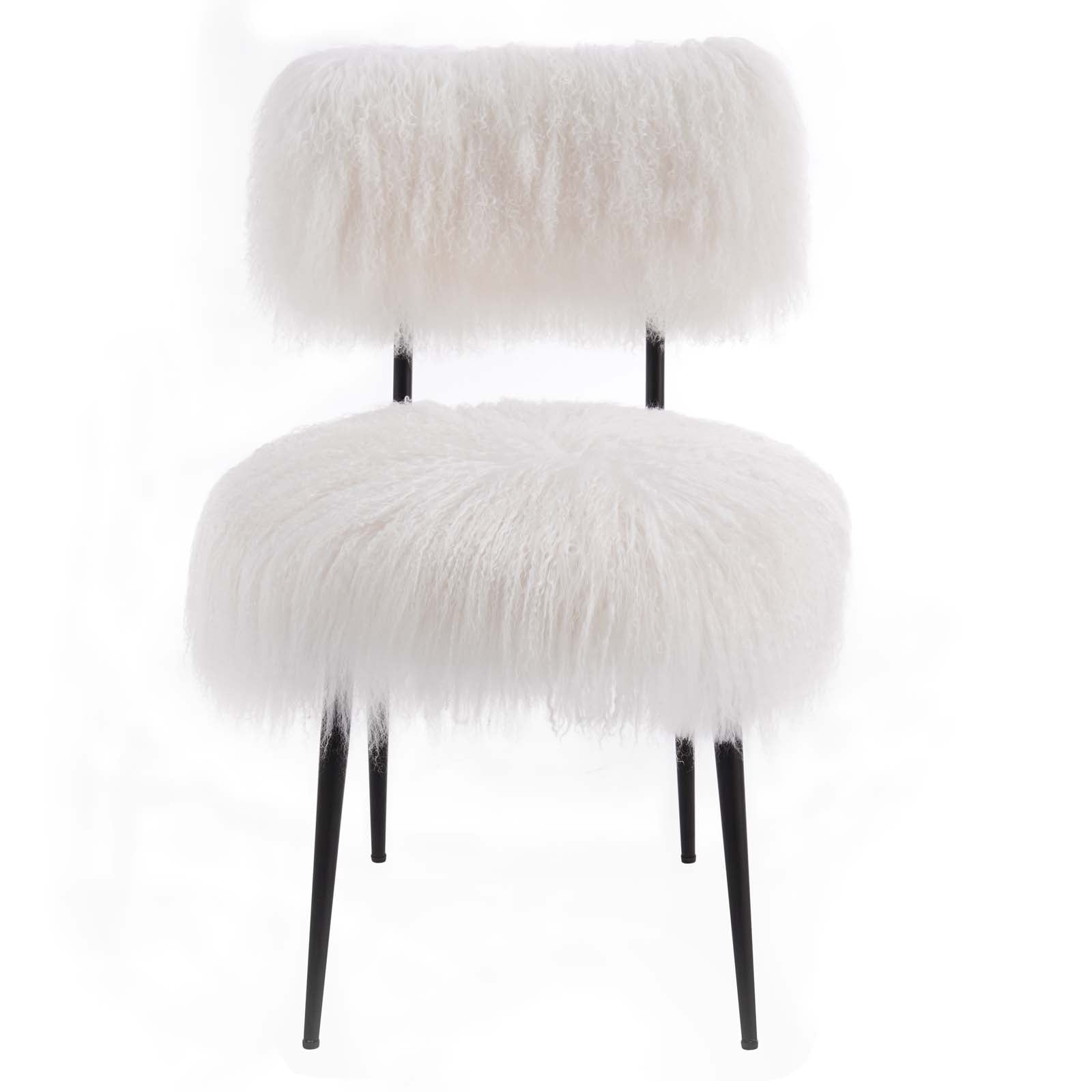 Animate your living spaces with the dynamism and style of the Skylar Sheepskin Chair, an exciting finishing touch in mid-century modern, bohemian, or eclectic settings. Dense foam padding and genuine sheepskin upholstery ensure a comfortable and luxurious seat at the dining table. This mid-century modern chair brims with an abundance of flair, a classic accent piece in living rooms and apartment spaces. Skylar delivers sophisticated comfort with panache in your living room or lounge spaces. This sheepskin accent chair rests on sturdy matte black metal legs, fitted with non-marking foot glides to protect your floors.