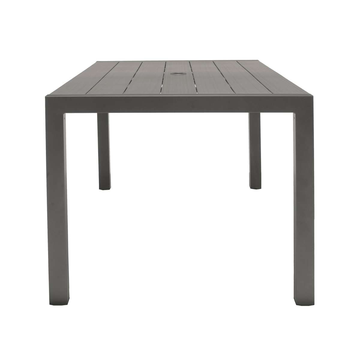 The Armen Living Solana Outdoor Rectangular Dining Table in Weathered Willow Wood Finish and Grey Frame Grey Frame is an ideal fit for your outdoor dining space. Built with a strong aluminum frame and weathered willow finished wood, the Solana is aesthetically pleasing as it is functional. Below, 4 metal legs maximize leg space while maintaining a solid foundation for the table above. Stylish and durable, the Solana dining table is available in a weathered willow finish and is completed with a convenient umbrella hole so that you can maximize your time outside. The Armen Living Solana collection features outdoor dining chairs, occasional tables and an outdoor sofa and are available in a cosmos grey finish.