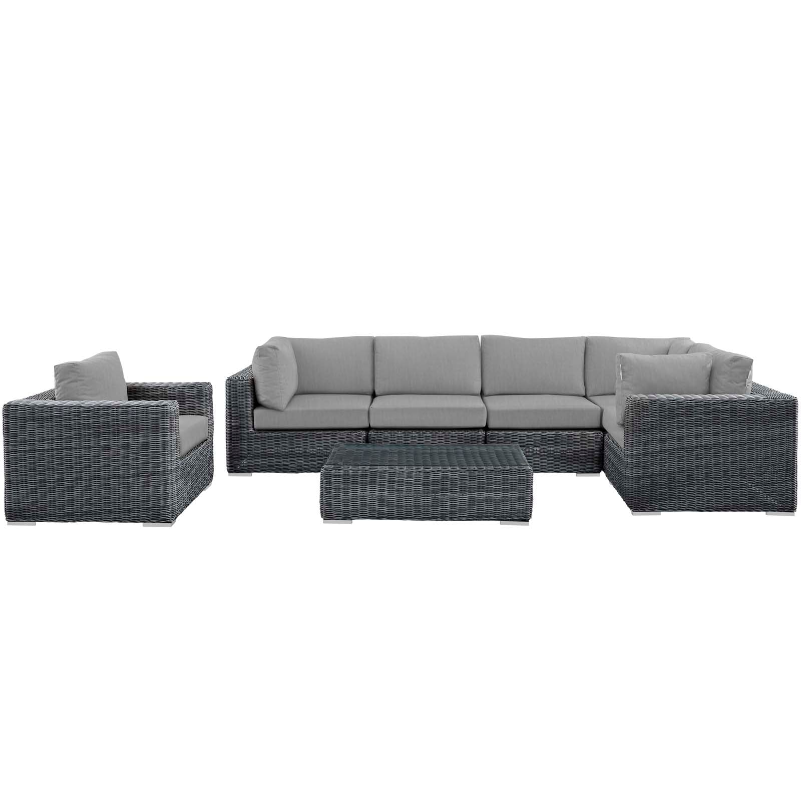 Set Includes: One - Summon Rattan Outdoor Patio Armchair One - Summon Rattan Outdoor Patio Coffee Table Three - Summon Rattan Outdoor Patio Corners Two - Summon Rattan Outdoor Patio Armless Chairs