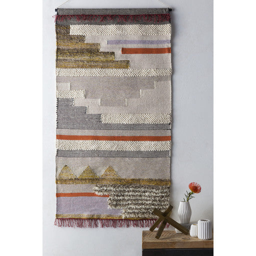 Check out our wall Decor from the Anaruz Collection! This great piece was handwoven by expert artisans in India. Made from 50% Wool, 35% Cotton, and 15% Metallic thread. These have a Fringe/Tassel detail, and come in custom sizes to suit your needs. When cleaning these should only be wiped clean with a dry cloth only.