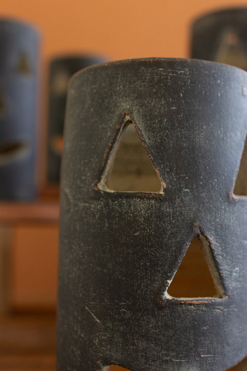 Start spooky night off right with this tall black clay jack-o-lantern.. This large luminary pairs well with others of the same size or shorter variety. Use a candle inside or let it shine alone inside or out.