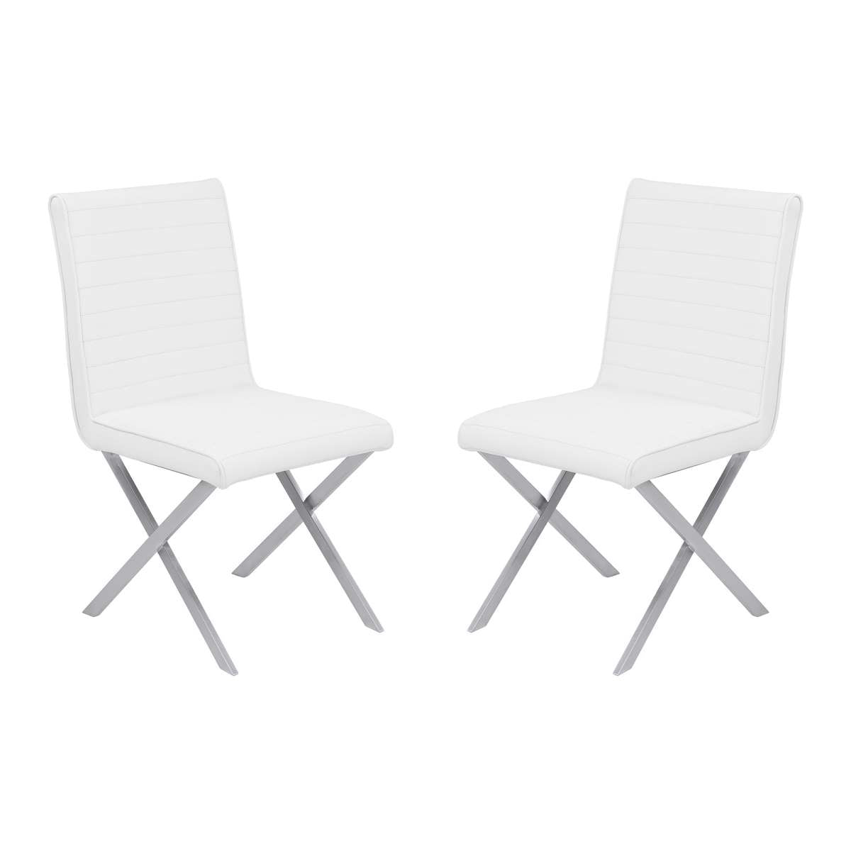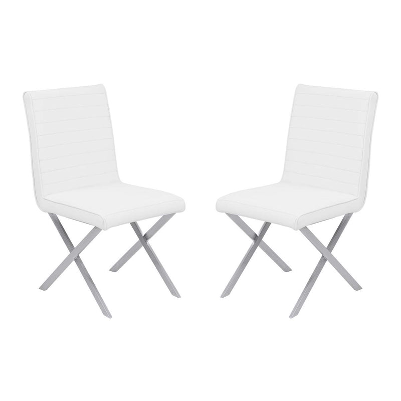 The Armen Living Tempe contemporary dining chair is both stylish and practical, a perfect addition for any modern home. The durable brushed stainless steel cross-legs are expertly designed to be both aesthetically pleasing and complimentary to the plush faux leather upholstered seat. The design of this piece allows it not only to function in the dining room, but in every other room in the house as well. The Tempe is sold in a set of two and is available in three stylish colors; Gray, black, and white.