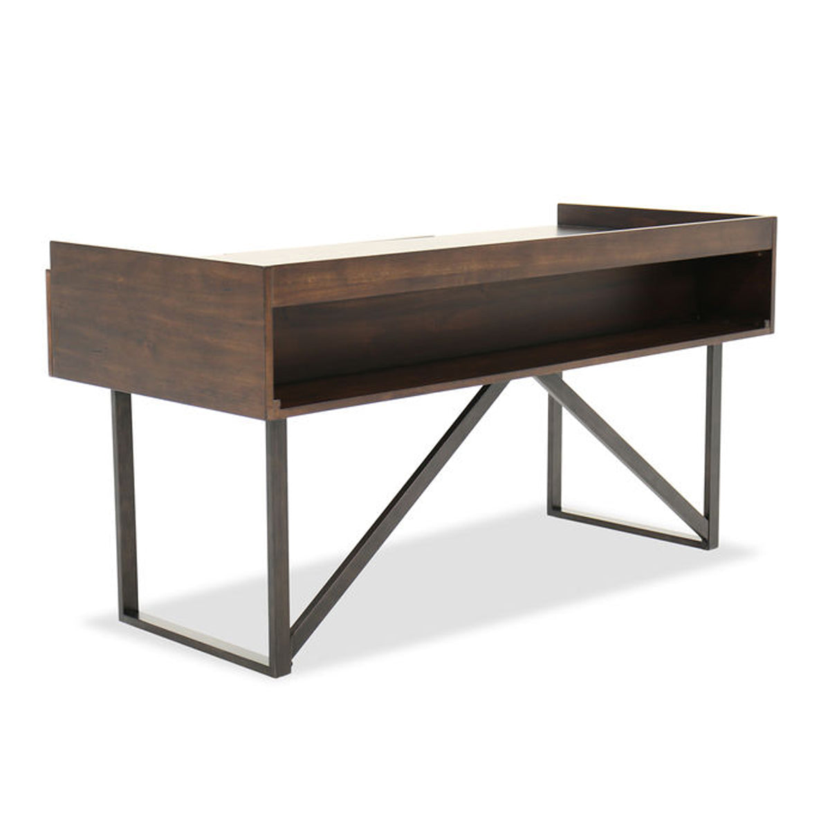| Constructed from sturdy engineered wood, acacia veneers in brown finish and supported by metal base. |