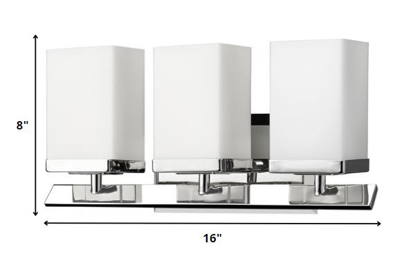 Elevate the look of any space easily and add brightness to it with this Three-Light Silver Frosted Glass Wall Sconce. The wall bracket has a general rectangular shape with beveled edges and a wide body. Attached to there is a flat piece of metal that holds the three lights on top of it. The hardware pieces are all colored to a silver finish. The shades are made from frosted glass and are in a short rectangular shape for the perfect soft touch. This wall sconce will look great on its own in the hallway or entryway, or you can put up a few in any room to freshen up the decor. 8" H x 16" W x 5.5" D