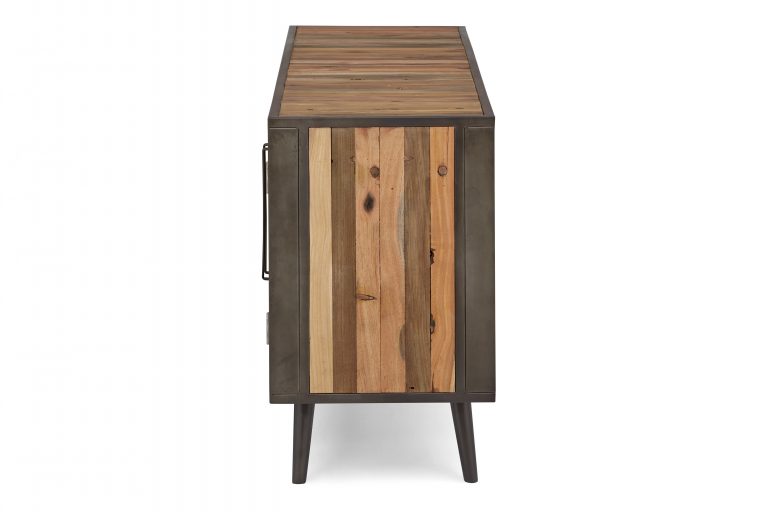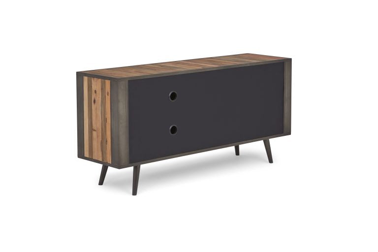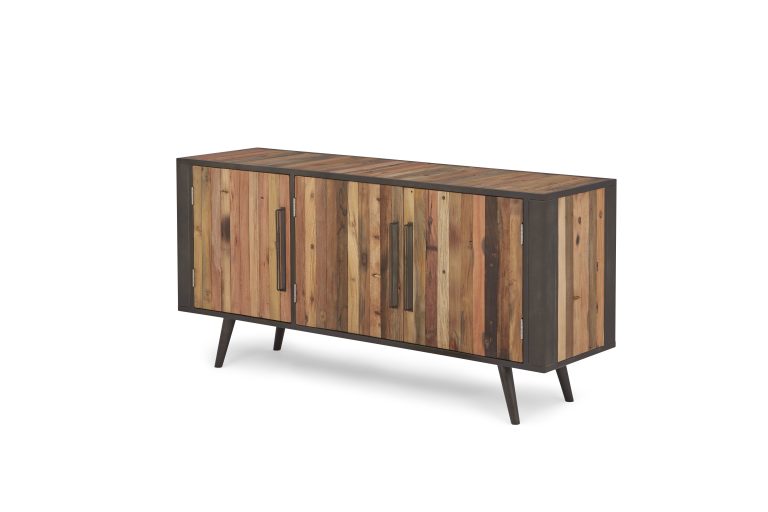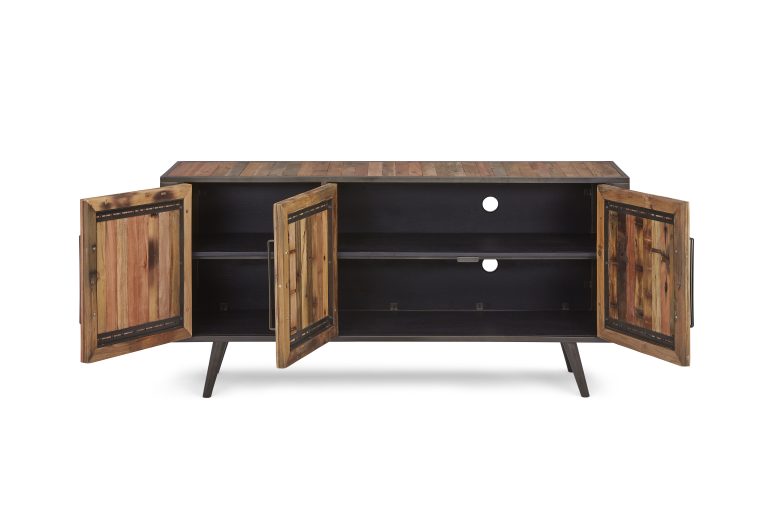 This TV stand is a storage piece that every living room deserves. The three doors, with fixed shelving behind, provide ample storage for all of your entertainment needs. Cord cut-outs are in place for ease of connectability. This piece is made by hand using reclaimed boatwood, that is carefully peeled, sliced and sanded. A transparent finish highlights the woods natural color variations and textures.