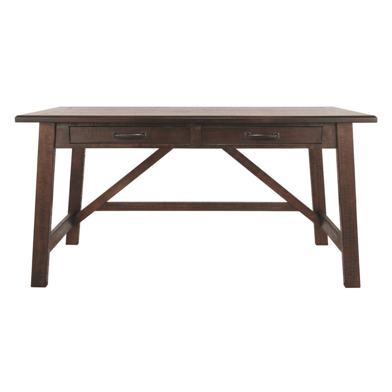 This writing desk can turns any empty space into a convenient workspace. It has wooden construction in brown finish and is supported by sturdy cross stretcher brace design. It features smooth surfaced table top with wooden details which can be adorned with lamps, table clock and other smallDecorative items. The two spacious drawers can hold pens, notebooks and other office supplies. This piece of furniture will bring rustic appeal to yourDecor and will enhance the vibe of the interiors.
