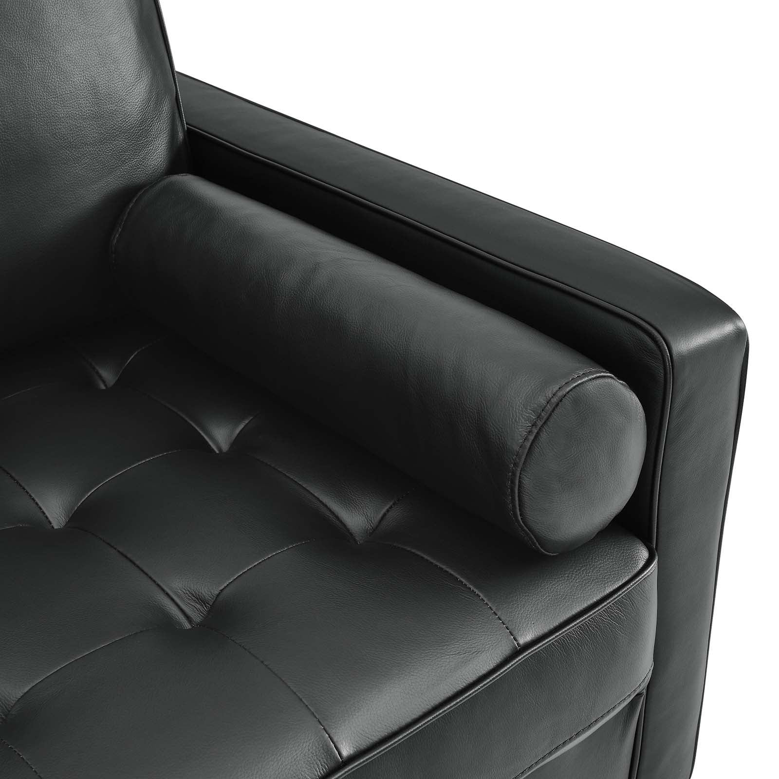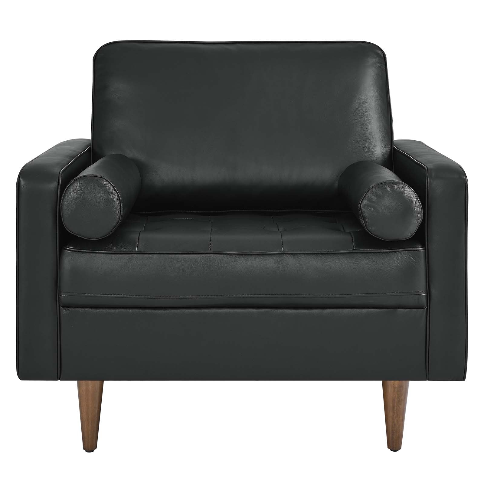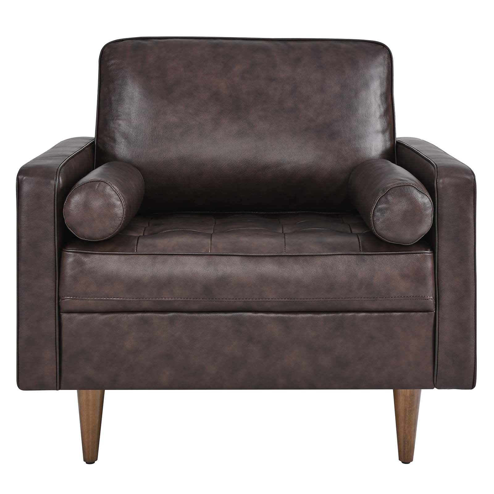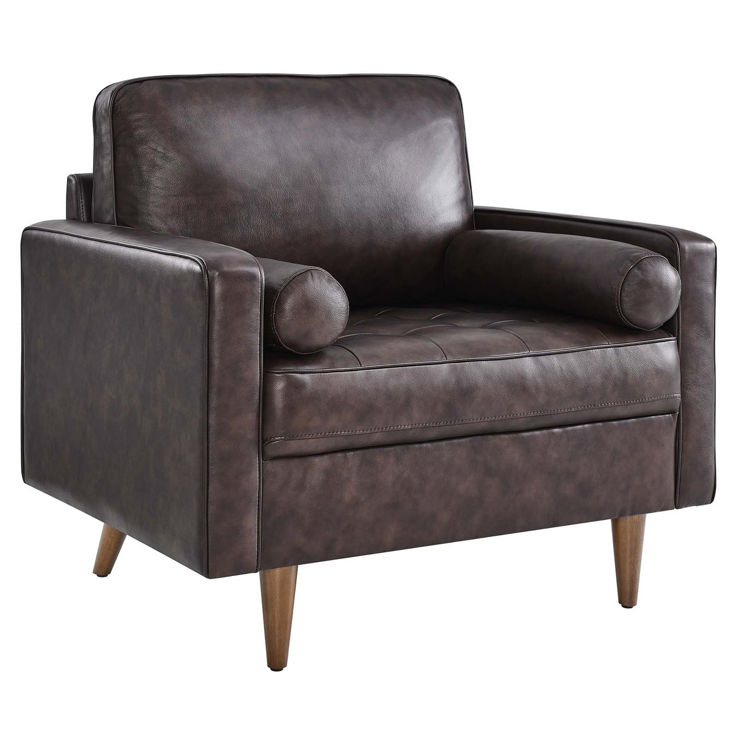 Update your home or apartment with the mid-century style and modern-day convenience of the Valour Leather Armchair. This comfortable armchair features a tailored profile with elegant biscuit tufting and two bolster pillows. Covered in beautiful top grain leather upholstery, this accent chair has dense foam padding, an innerspring pocket structure, and a sinuous spring support system for a comprehensive seating experience that fits perfectly into apartment settings. This luxe modern armchair comes with walnut-stained wood legs and non-marking foot caps to protect floors. Say goodbye to the days of hauling heavy furniture. This tufted armchair ships in a portable box for easy maneuvering. Weight limit: 330 lbs.