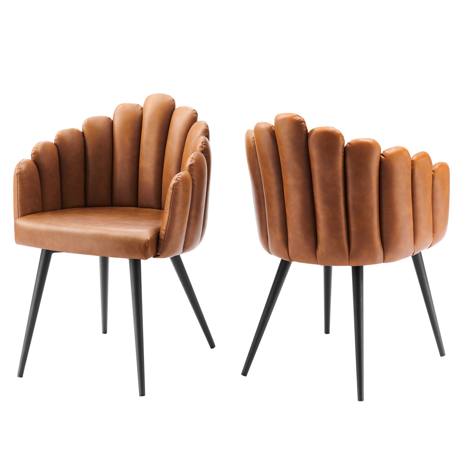 Introducing the Vanguard Vegan Leather Dining Chair for your prime seating and viewing pleasure. Exquisite vertical channel tufting and a captivating scalloped silhouette add a retro modern touch to your dining room, living room, or entryway. Dense foam padding and durable vegan leather upholstery guarantees ultimate comfort for you, your family, and guests. This sturdy armchair rests confidently on a low-profile, powder-coated black metal frame with gently sloped legs and non-marking foot pins.