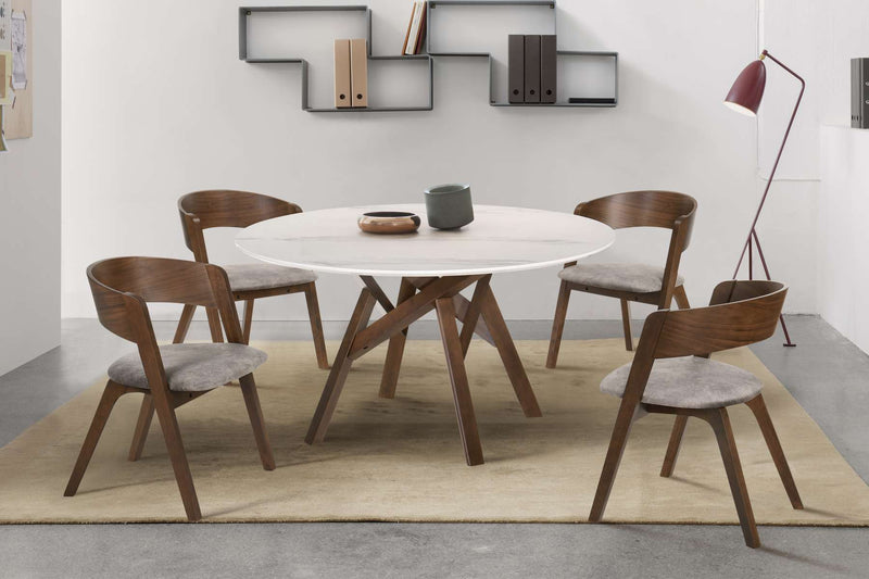 The Armen Living Venus 5 piece dining set are both simple but elegant that will complete any contemporary style home. The table has sleek walnut wood finish with 4 pointed leg base, compliment with a beautiful white marble top. The Venus table comes with 4 Jackie walnut chairs that feature upholstry seats and back for optimum comfort. The beauty of this pairing lies in the subtle interplay of soft and neutral colors with a modern design structure. This piece is practical, yet highly appealing, making it the ideal combination for any contemporary dining room. Features: 54" Round, 30" H (Dining Table) 21" W x 22" D x 30" H (4x Dining Chair) Sleek dark table is calmed by the soothing neutral colors of the accompanying chairs Chairs offer exceptional back support while the table assures dependability Venus Contemporary Dining Set comes with 1 Table in dark finish and marble top, and 4 Jackie Walnut upholster Chairs