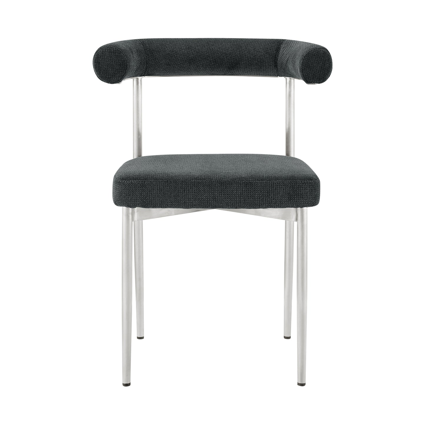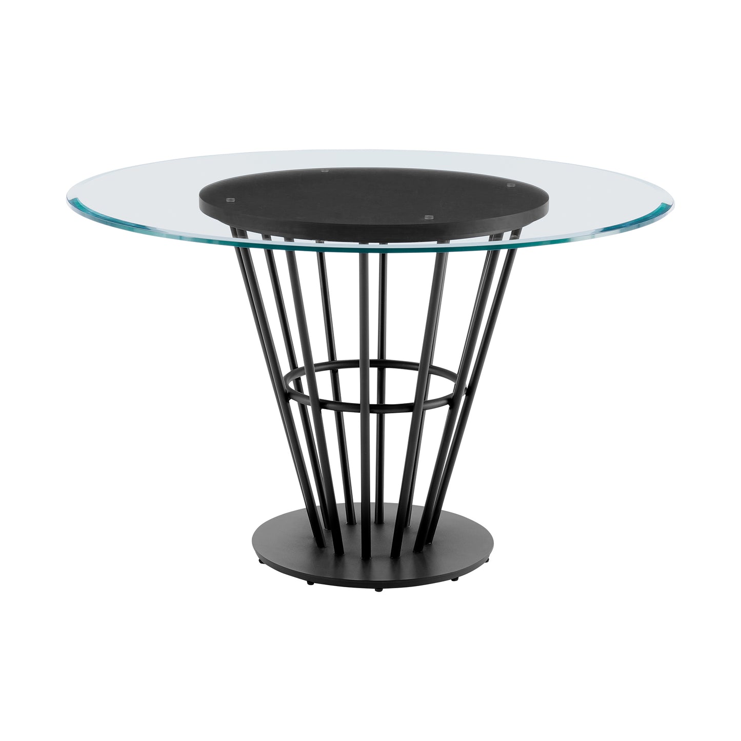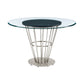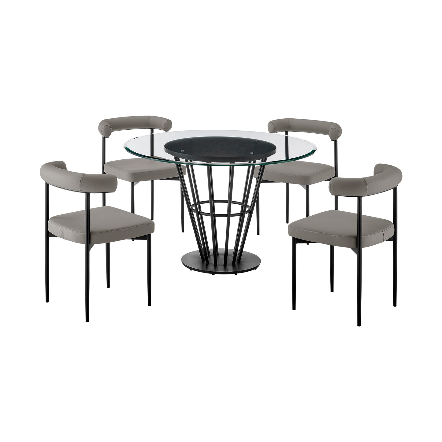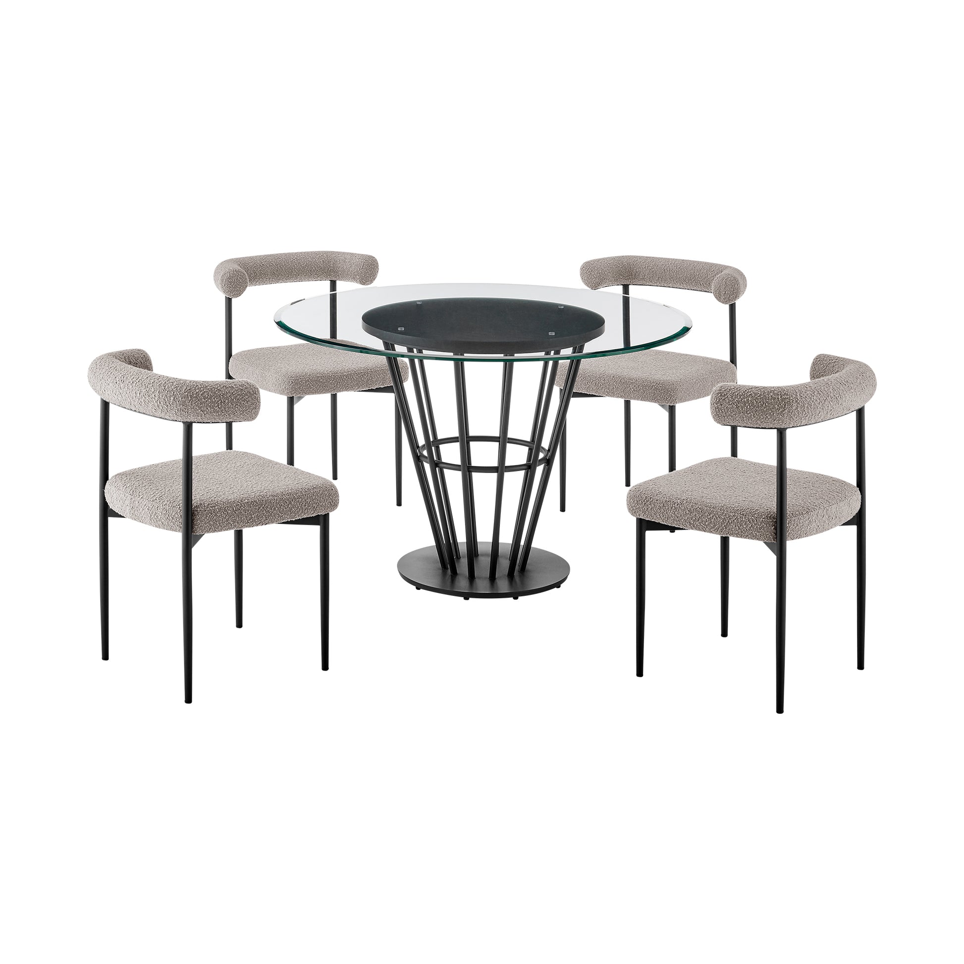 Bring sleek sophistication and comfort to your dining space with the Veronica Shannon 5 Piece Dining Set by Armen Living. This set includes 1 Veronica Round Glass Dining Table and 4 Shannon Upholstered Dining Chairs. With a chic and refined aesthetic, this dining set is ready to make a statement. The dining table includes a 48" glass tabletop that rests on a round walnut veneer panel for a beautiful contrast of materials. The conical base attains a sleek and airy presence with its metallic detailing. The Veronica dining table serves as a stunning centerpiece for your kitchen, dining, or living space, and its round shape creates a natural hub for inclusive conversations and activities. Our Shannon dining chairs serve as a perfect compliment to create this contemporary and modern dining set. The Shannon chair includes a cylindrical cushion and curved backrest to offer perfect back support and a generously padded seat to provide a comfortable seating experience. These chairs are covered in performance fabric to offer easy care and maintenance. This dining set can grace your kitchen, dining room, or living space to make a stunning centerpiece, while it adds a dose of sophistication and comfort from your casual to formal meals. The dining set features quality materials and craftsmanship to serve you for years to come. The Veronica Shannon 5 Piece Round Glass Dining Table Set is available in matching finishes and a variety of colors, or sold separately to achieve any look you desire.