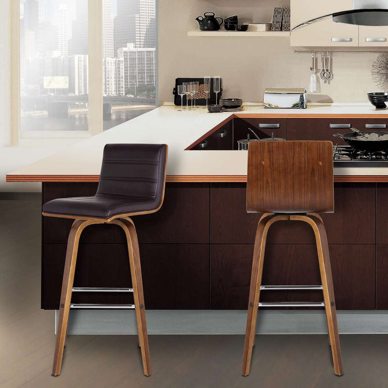 The Vienna 30" Swivel Brown Faux Leather and Walnut Wood Bar Stool by Armen Living provides both versatile style and comfort with a Mid-Century Modern design that can easily be integrated into your home's current décor. The 360-degree swivel function provides optimal mobility so you and your guests to stay engaged regardless of your place in the room at parties and gatherings. The Vienna’s frame is constructed of strong wood that is brilliantly accented by the plush high-density foam cushion that’s wrapped in faux leather upholstery. A square metal footrest is added for a chic and stylish aesthetic without comprising practicality and functionality of this item. The soft faux leather upholstery makes clean up a breeze, making this the perfect bar or counter stool for any entertaining home! With multiple bar seat height options and the armless design, you can easily pull the Vienna up to your kitchen island, peninsula counter, or home bar. The high seat back ergonomic properties to keep your back healthy and properly aligned. The Vienna is an ideal addition to any home or apartment and its quality materials ensure a comfortable seat for many years to come. The Vienna Bar or Counter Stool is available in 26” or 30” seat height and comes in your choice of a walnut wood finish with cream, grey, or brown faux leather or a black wood finish with grey faux leather.