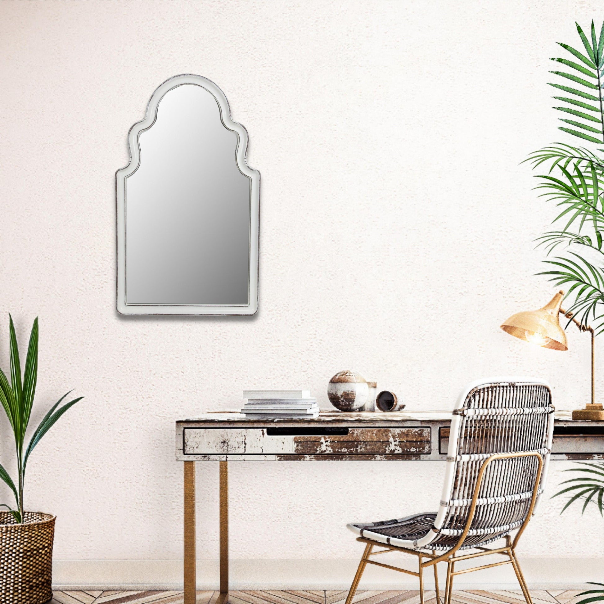 This Vintage Curved Gray Wall Mirror is the perfect way to add some brightness and design to any space in your home. The frame of the mirror is made from metal and has a vintage gray finish on it. The mirror in the middle has the same curved shape as the frame and creates wonderful symphony with the gray color as well. You can use this mirror anywhere in your home and really elevate the space without taking up any floor space at all. 24" H x 14.25" W x 1.25" D