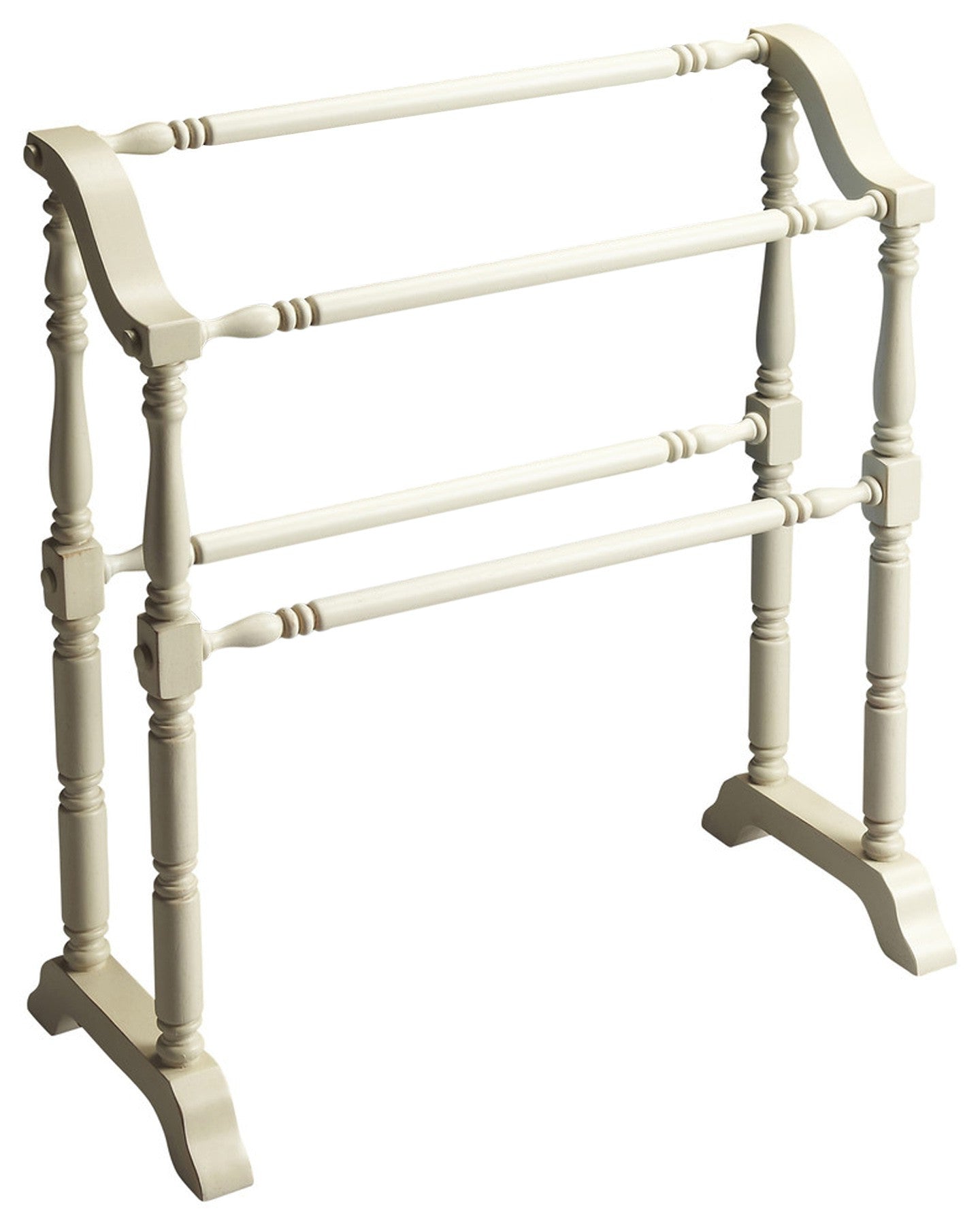 Traditional in style this Vintage Deep Cherry Blanket Rack is the perfect example of classic. Skillfully crafted from poplar hardwood solids, this gorgeous blanket stand is multipurpose in function. It features horizontally carved wooden rails that are semi-aligned at intervals to allow for easy hanging. The four classic wooden legs are placed on a pedestal with the entire rack covered in a Deep Cherry polish. 33" x 28" x 12.5"
