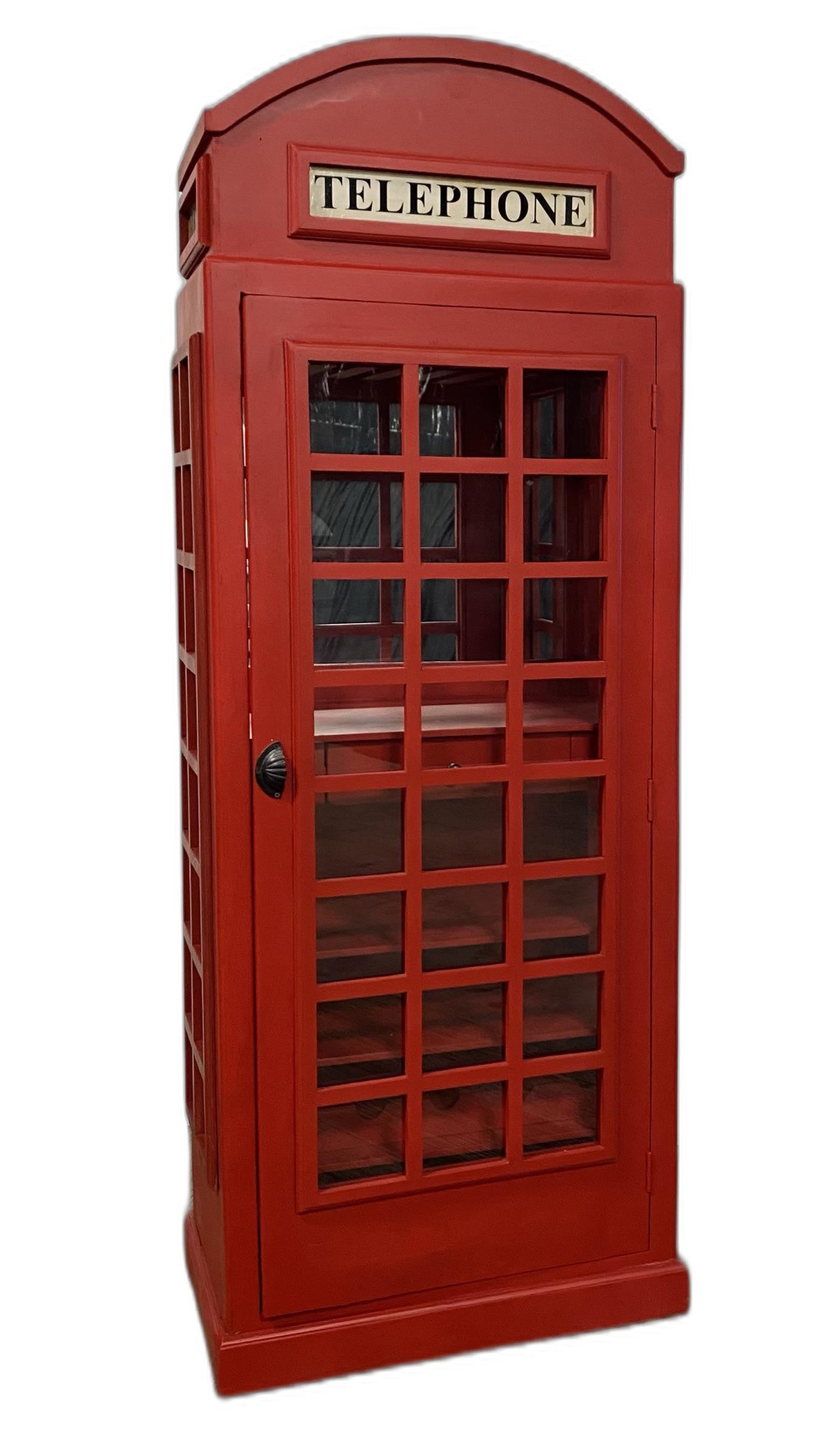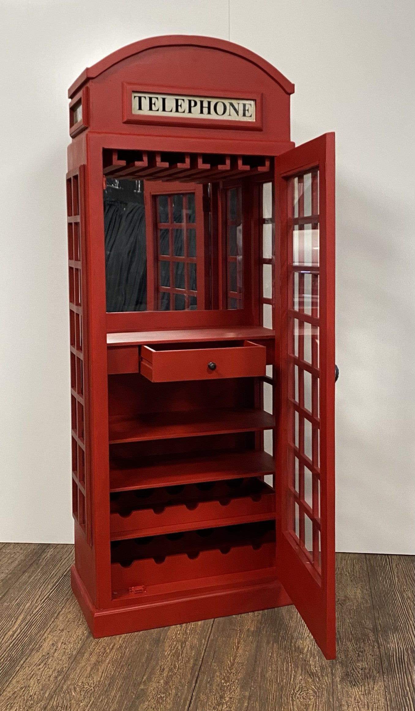 A super cool accent piece for your space that has practical storage and entertaining capabilities as well. This Vintage Red Wooden Phone Booth Bar Cabinet is a full-size replica of an old time phone booth that has lots of useful storage and display space inside. A double wine rack on the bottom houses 10 bottles, while the slots at the top of the cabinet hold approximately 8 wine glasses for your drinking pleasure. There are two shelves for storage, a single drawer to hold those coasters and bottle openers, and a mirrored back to pull it all together. An intersting and unique way to store and serve your wine and spirits, this phone booth cabinet will be a big hit. 79" H x 30.5" W x 16.5" D