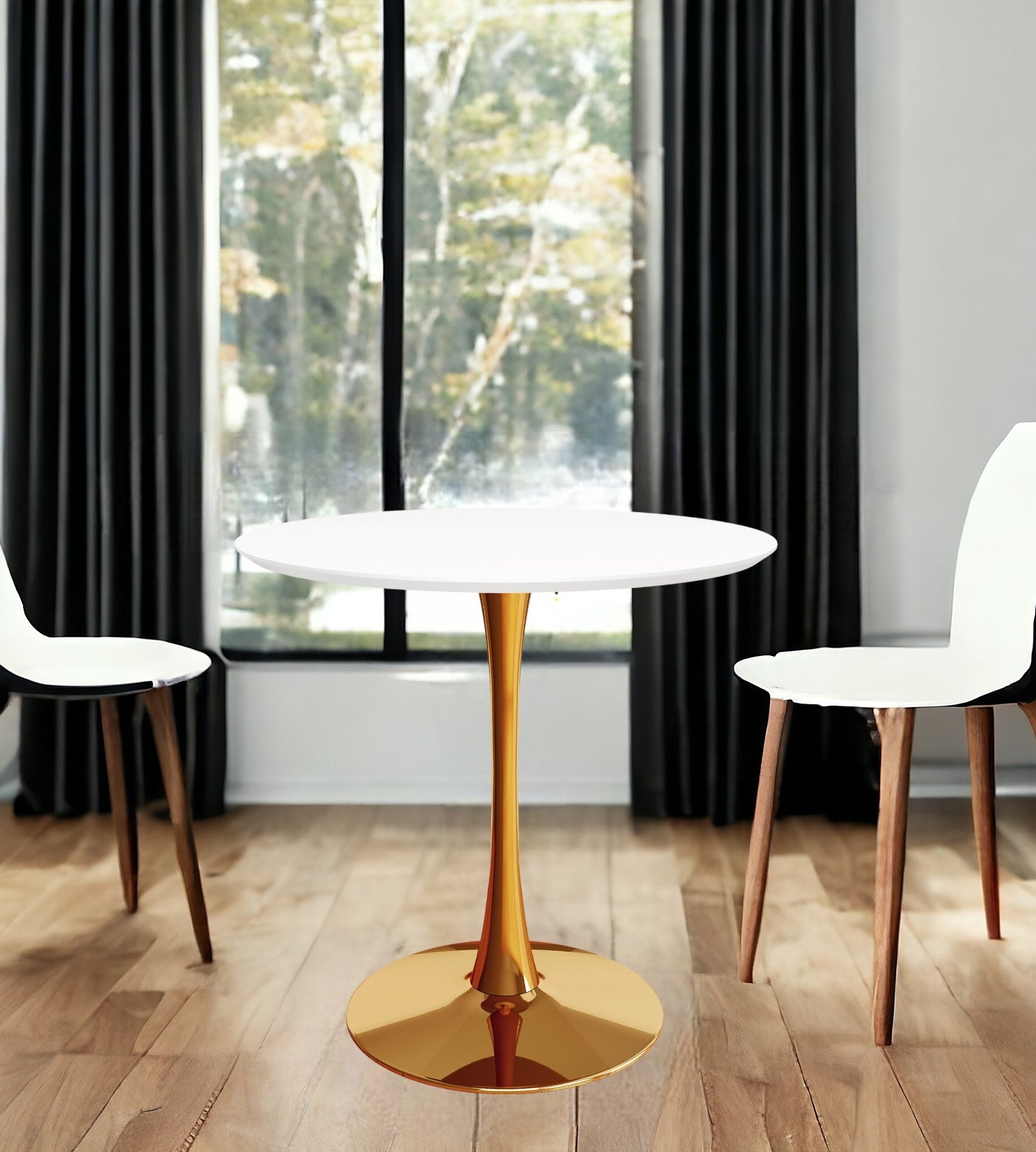 Stylish and super sturdy, the 36" white and gold metal dining table is an amazingly good-looking dining table that was made to become the centerpiece of your home. A gold metal frame is finished off with a white manufactured wood top that is the epitome of quality construction and design. The two-tone finish adds to it's appeal. A shiny and sheer gloss finish gives this table a bit of a modern and contemporary vibe. This table features a pedestal base that adds some depth and interest to your space. Seat up to 4 family and friends around your new dining table. This table is the sturdy, reliable and stylish answer to your dining room needs. This eye-catching dining table is ready for you to enjoy breakfast for one or entertain your guests. 29" H x 36" W x 36" D