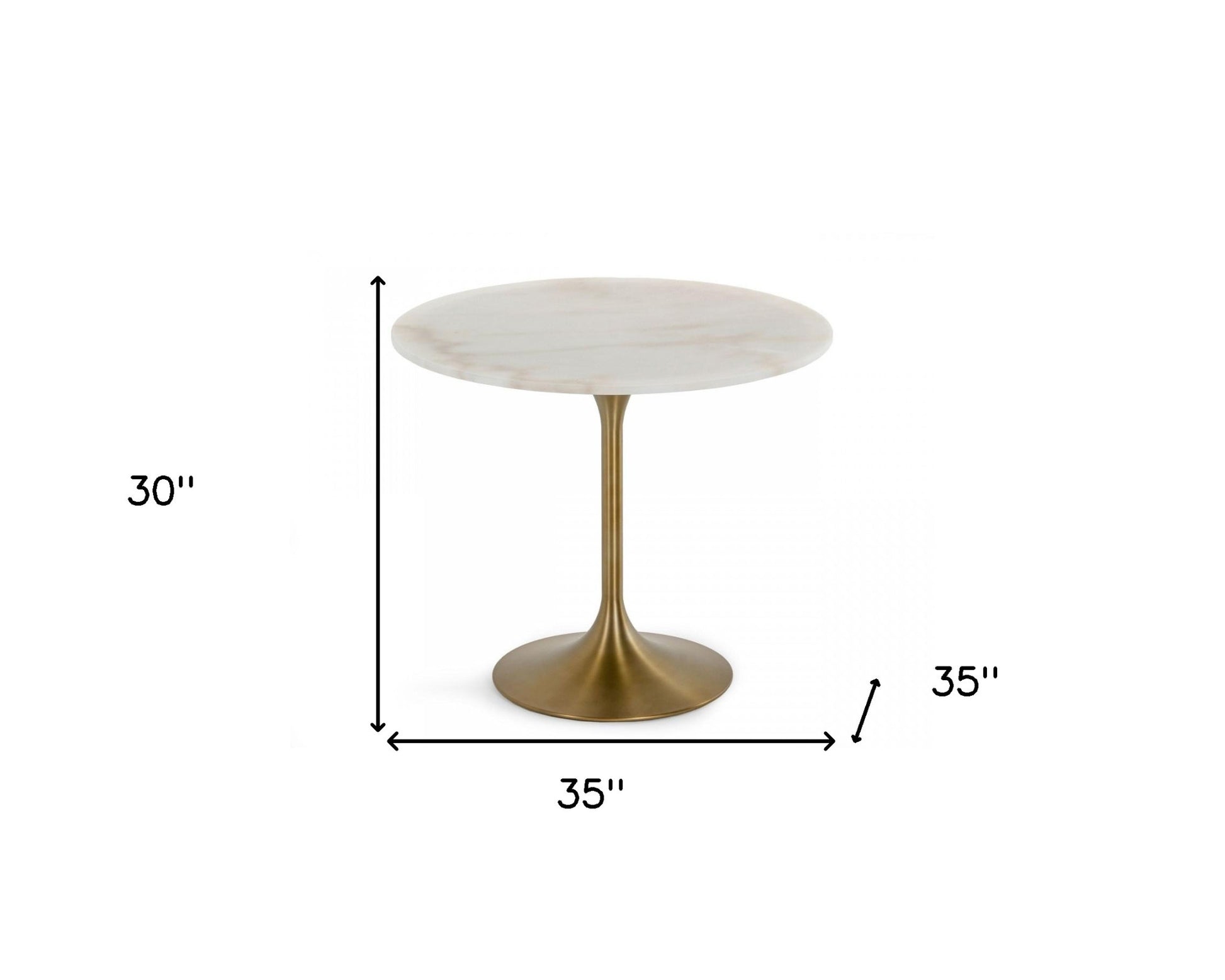 Make a statement with the 35" white and gold rounded marble and metal dining table and infuse a dash of character and personality into your space. Quality construction from the gold metal base combines with white marble of the top to give this table a fresh and updated two-tone look. A beautiful pedestal base adds some dimension and elegance to your dining. This dining table seats 4 people comfortably. Complete your kitchen or dining room with this well made and stylish table. The dining table is a symbol for togetherness, special meals, and conversation. This 35" white and gold rounded marble and metal dining table is a must-have for your home. 30" H x 35" W x 35" D