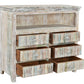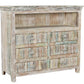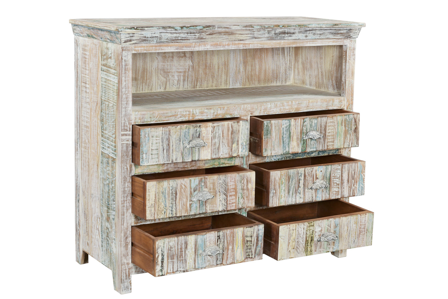 Ready to be enjoyed in most any room, this 50-inch white distressed reclaimed wood open and enclosed storage entertainment center is a practical and good looking piece of furniture that will help to anchor your room. Designed to be sturdy and long lasting, this versatile furniture piece is hand-crafted from durable reclaimed wood and features a rustic design style. Featuring a natural and white with multiple patinas, the finish is purposefully distressed to give this piece a vintage and rustic feel, this chic media center includes open cubby space and six drawers to offer lots of storage. Ideal for TV placement and storage in your living room, bedroom or office. 42-inch h x 50-inch w x 18-inch d.