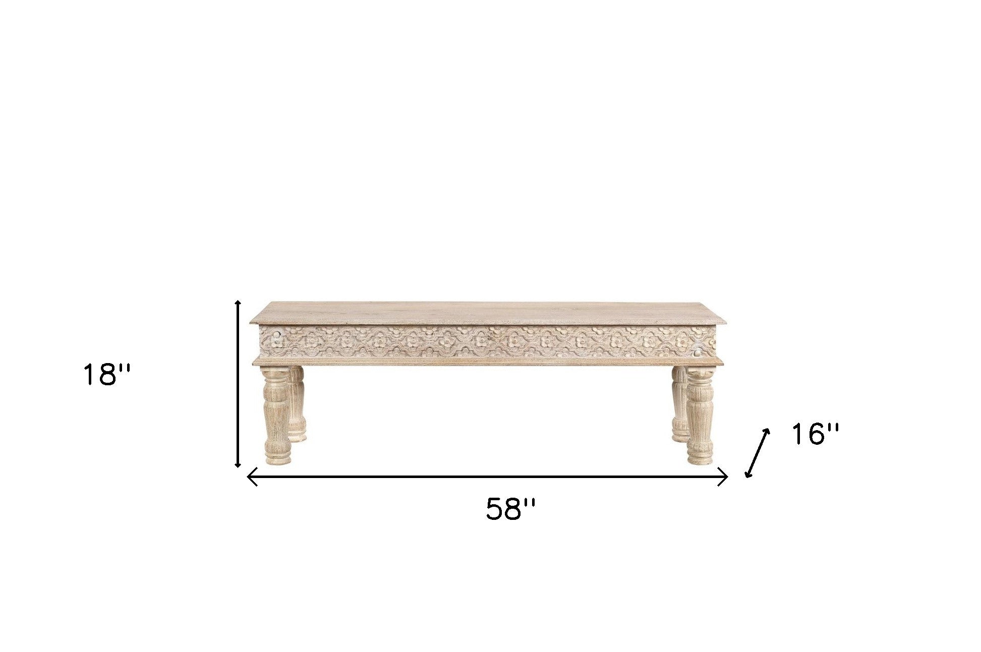Add a good looking decorative accent to your space that is also practical for seating. Made of high quality solid wood, the all over white coloration gives this piece an updated and refreshing look. The purposefully distressed finish gives this versatile bench an authentically rustic feel. Add this bench to your kitchen or dining room for convenient seating at the table. Easy to blend into most any room, a bench is a way to add a good looking accent to your space that can also be practical and useful. 18-inch h x 58-inch w x 16-inch d