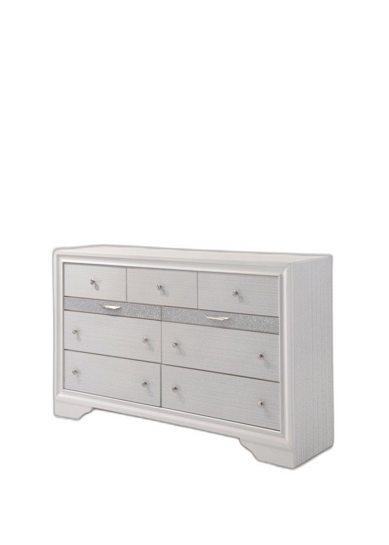 Enhance your room into a visually delightful and highly functional space with this 63" white manufactured wood nine drawer triple dresser. Designed for you to stand in front of and get ready, this horizontal triple dresser has a convenient and wide top area for your getting ready needs and supplies. Loaded with maximum capacity, this piece is equipped with nine easy open drawers for practical and good looking clothing storage. Its a high quality piece, made from high grade manufactured wood. The white coloration of this piece is neutral and will blend easily with most any decor. 39" H x 63" W x 17" D